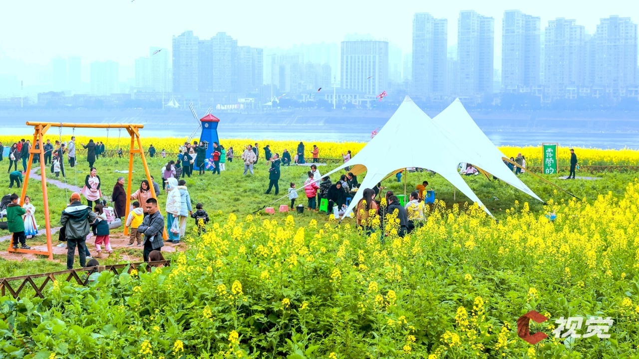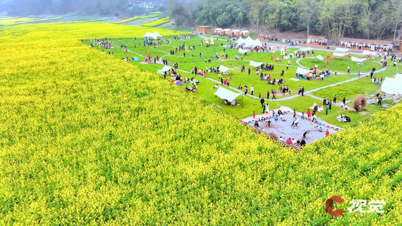 近日,位于长江边的泸州市合江县白米镇金宝山村,成片的油菜花已全部盛开,吸引无数游客前来露营赏花,感受春天味道。花海、长江、城市、野趣……绘就出一幅幅春意盎然的和美乡村画卷。