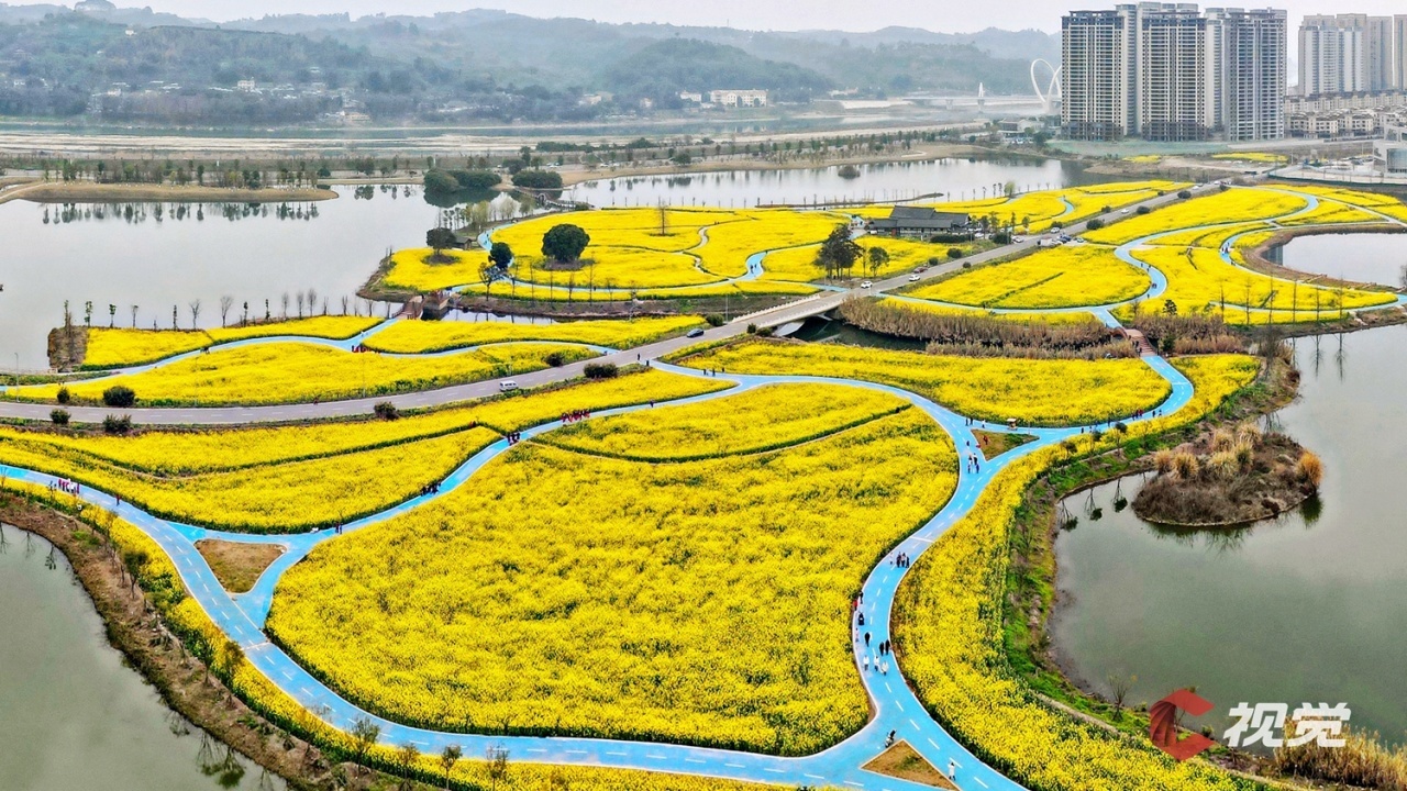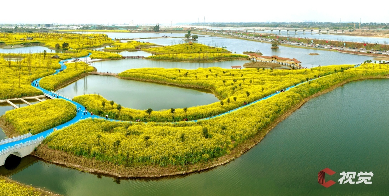 眉山市彭山区“五湖四海”湿地公园内的上千亩油菜进入盛花期, 吸引了众多游客前来踏春赏花,领略怡人春色。