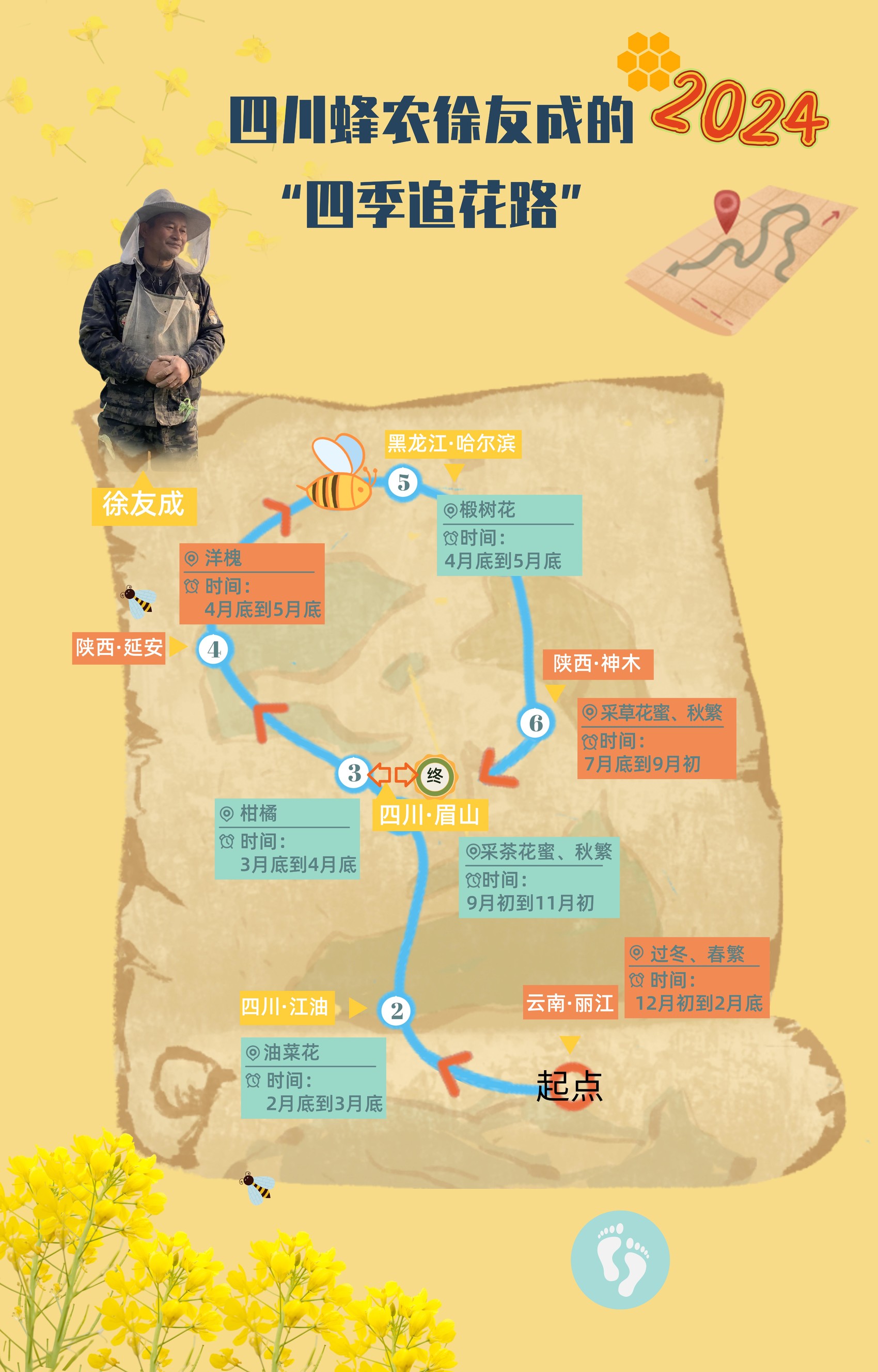 每年“追花夺蜜”前,徐友成会大致计划一个路线,但受气候变化,蜜源情况不同等因素影响,“路线变动也是常有的事”。