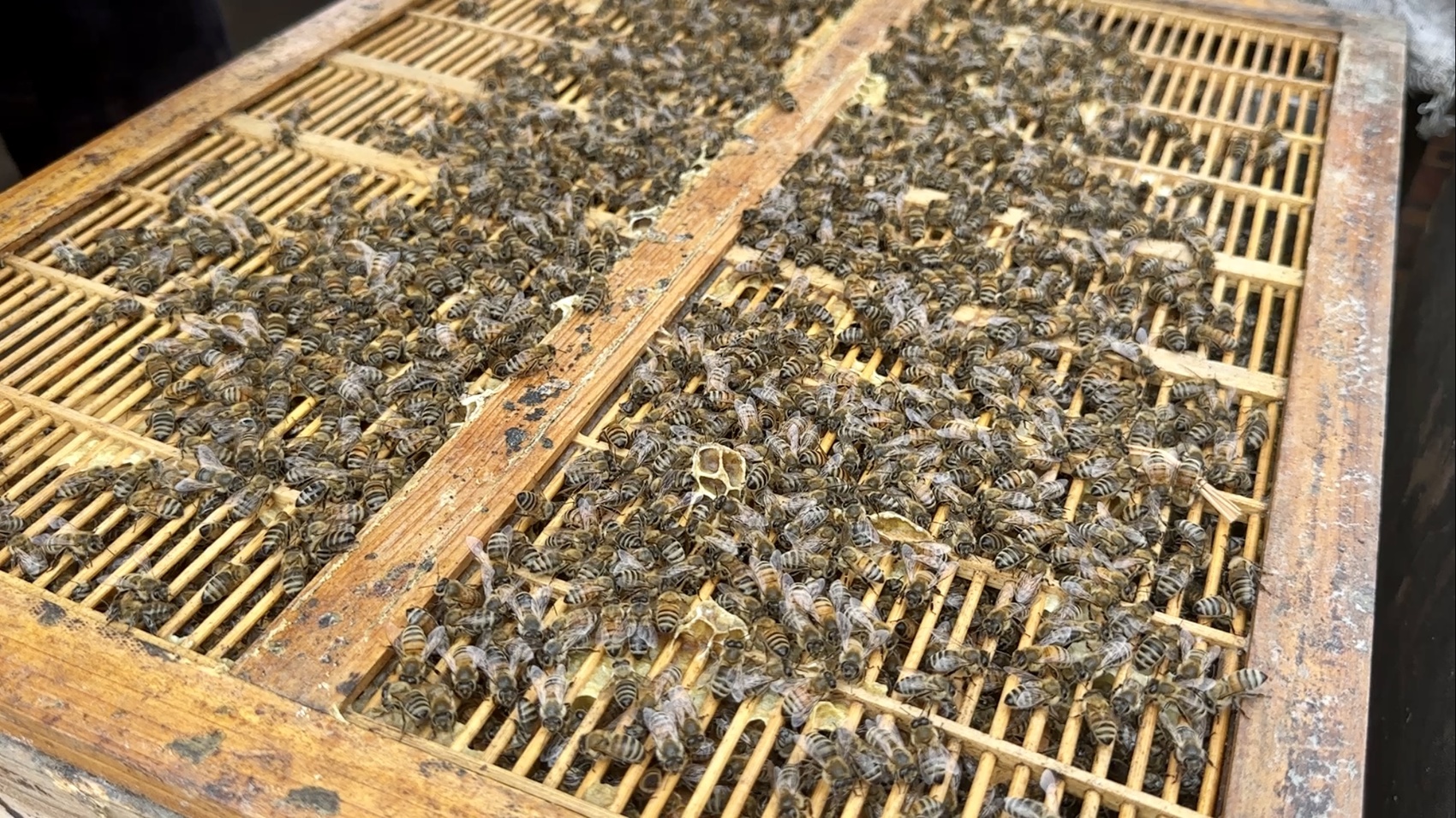 “现在在整理蜂箱扩大储蜜区,这样一箱蜂一次可取蜜20多斤。”徐友成现在养殖了500多箱西方蜜蜂(下称“西蜂”),都是他引以为傲的“双王群(一群蜂内有两个蜂王)”,繁殖高峰时一箱有4万到5万只蜜蜂。