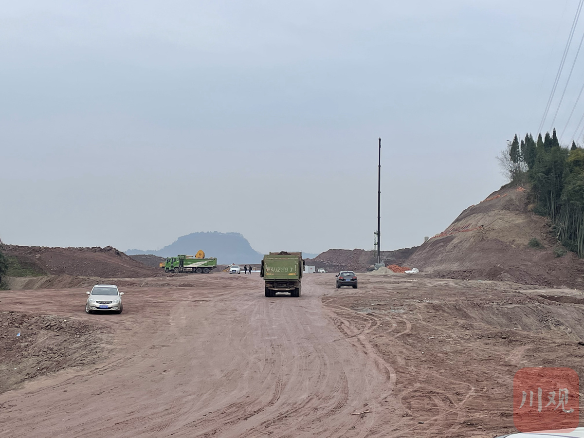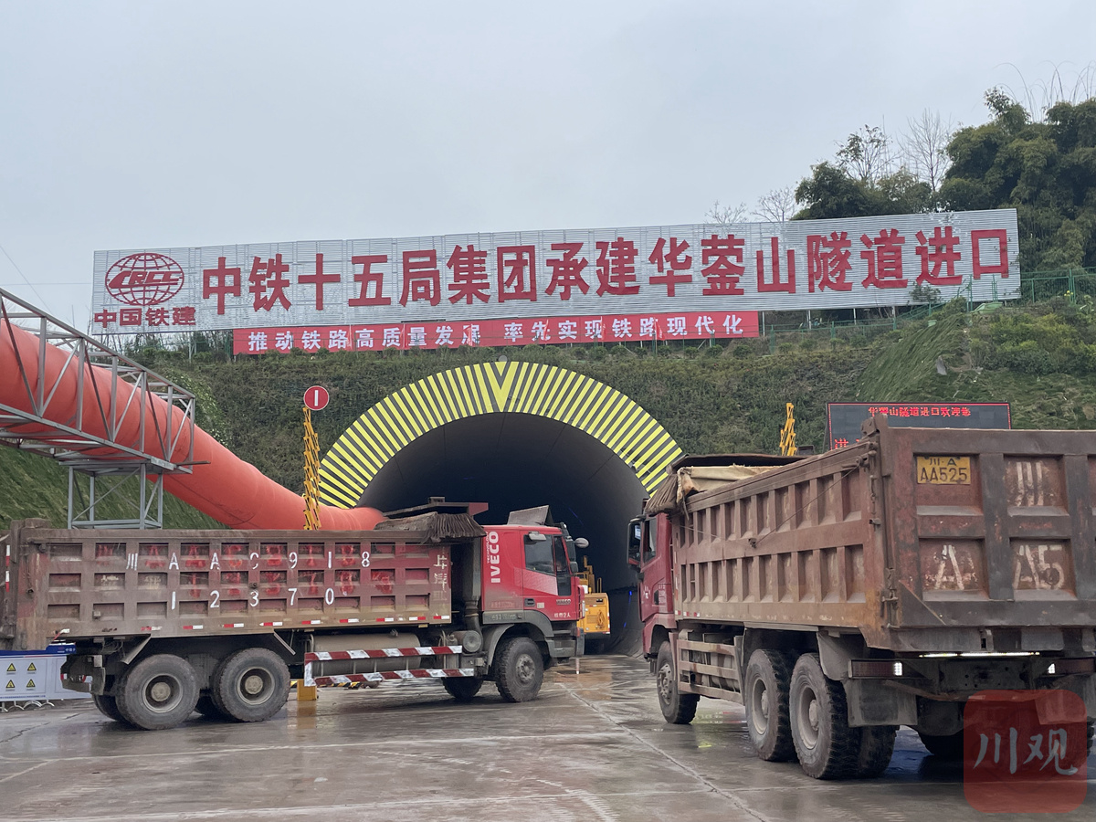 3月8日下午,大竹县清水镇,西渝高铁华蓥山隧道进口处,数台运输车往返运输,建设现场一片繁忙。