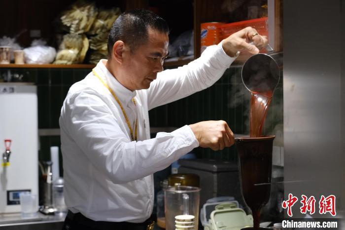 近日,余庆池在中英街的分店内“煲奶茶”。记者 蔡敏婕 摄