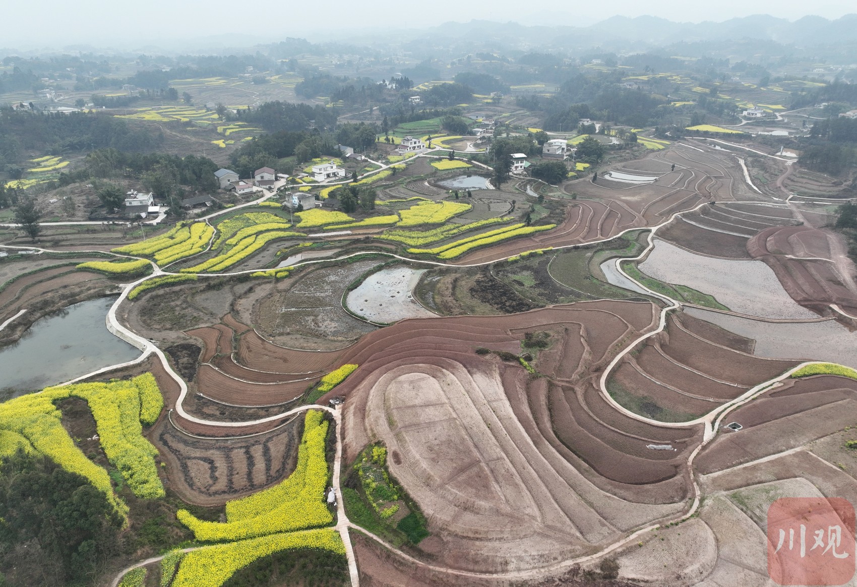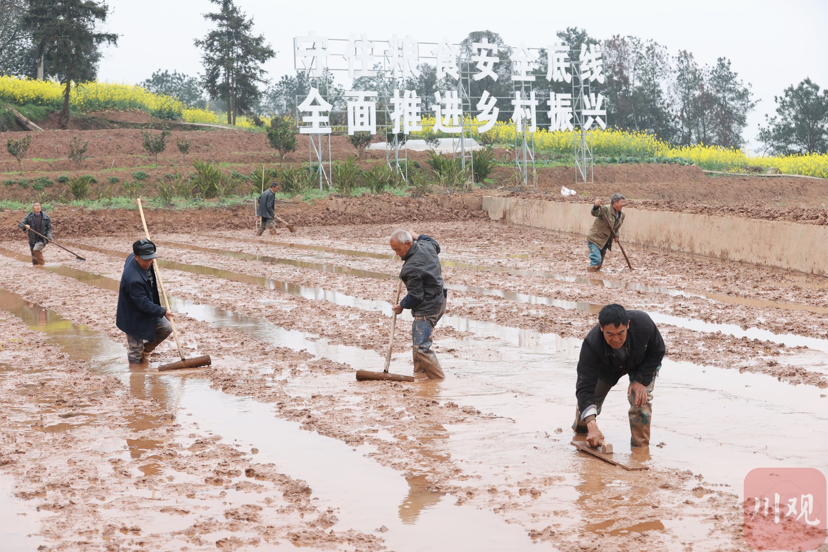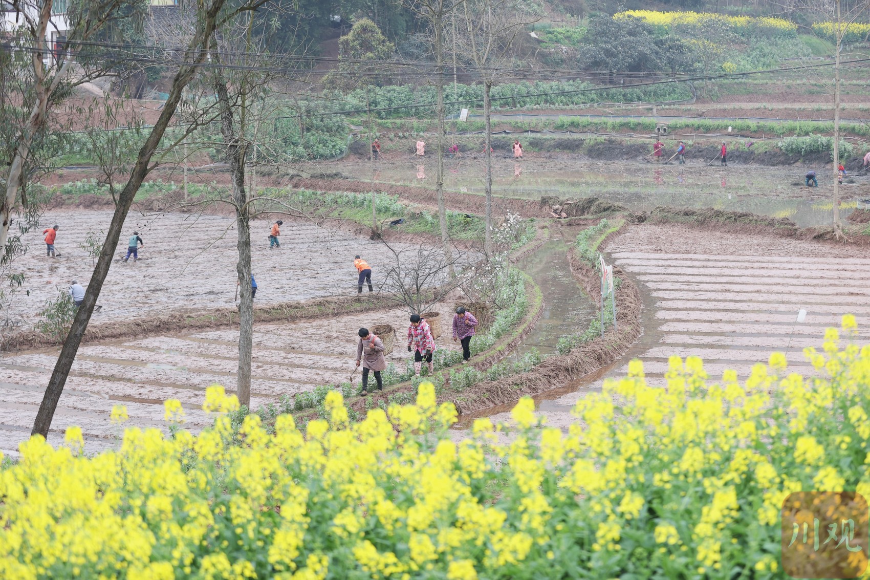 在李庄镇安石村与李端镇其林村的水稻示范基地里,连片秧田错落有致地分布在春日大地,农户们正趁着暖春有条不紊地开展水稻育秧作业。整地翻土、平整秧田、撒种施肥,在漫山金黄的油菜花间,农户们翻开希望的土地,种下收获的种子,勾勒出一幅“人勤春来早”的春耕美好图景。