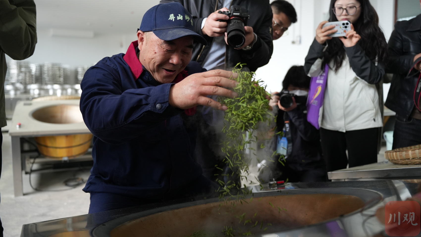 另一边,屏山炒青传统制作技艺第五代非遗传承人刘兆斌向采访团展示了传统手工炒青技艺。“炒茶温度在300度左右,炒一次需要7—8分钟,我们用手直接翻炒茶叶是为了更好地感受茶叶的温度,这样才能炒出优质茶叶。”刘兆斌告诉记者,他从1982年起接触炒茶,经历了从在家门口炒茶、茶厂里炒茶,再到园区里炒茶等多个阶段,至今已有42个年头。