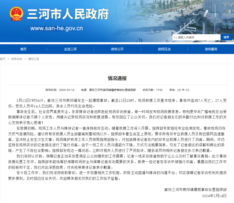 我们深刻认识到,保障记者正当采访是满足公众知情权的工作需要,记者一线采访报道有助于让公众及时了解事实真相。此次事故救援处置工作中,指挥部未能统筹好保障现场安全与保障记者采访需要的关系,致使一些记者在采访中被强行劝离,暴露出我们工作中的短板和不足,我们对此深感自责,对央视等媒体记者表示歉意。