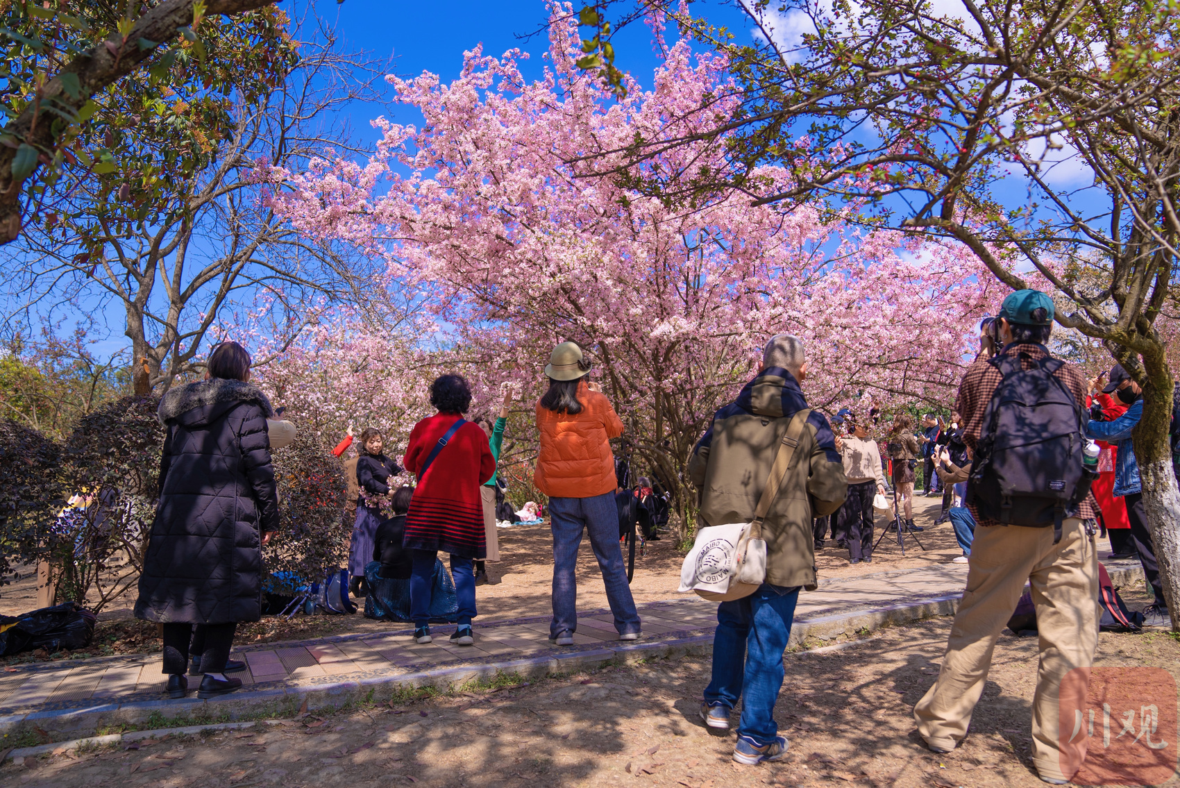 美人梅、垂丝海棠等花卉在蓝天白云的映衬下显得更加娇艳动人,吸引了大批游客驻足观赏。他们或拍照留念,或轻声交流,尽享春天的温暖与美好。