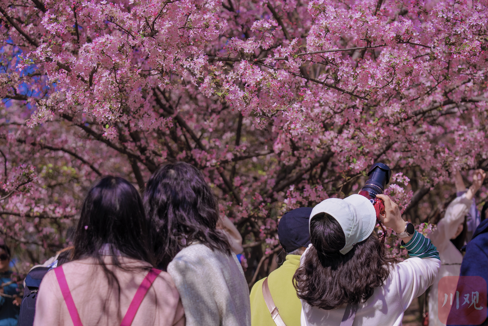 3月13日,市民游客在成都植物园内观赏垂丝海棠。