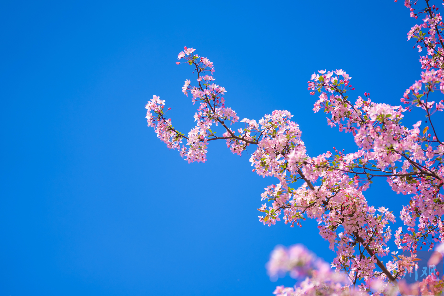 3月13日,在蓝天白云映衬下的垂丝海棠。