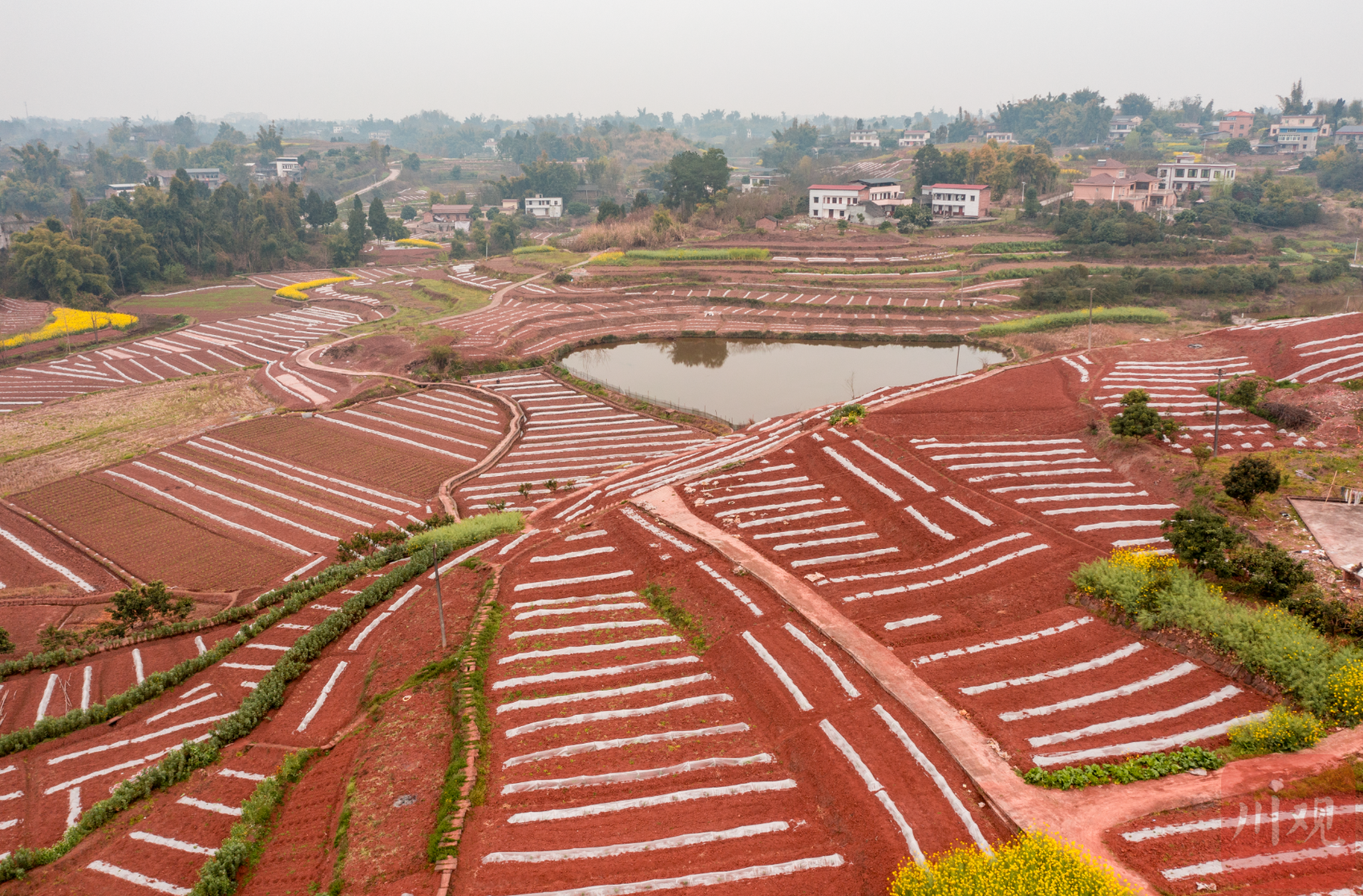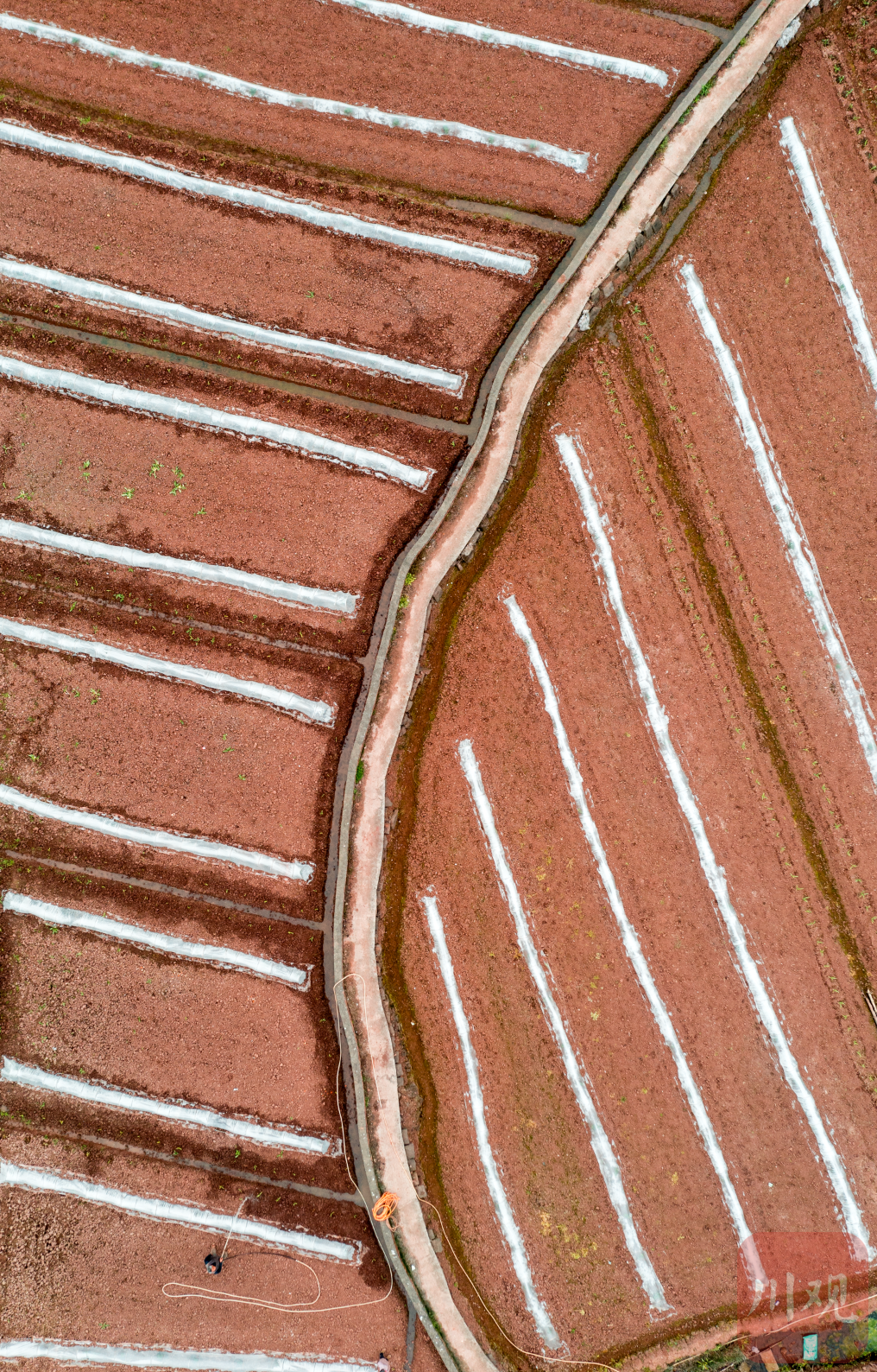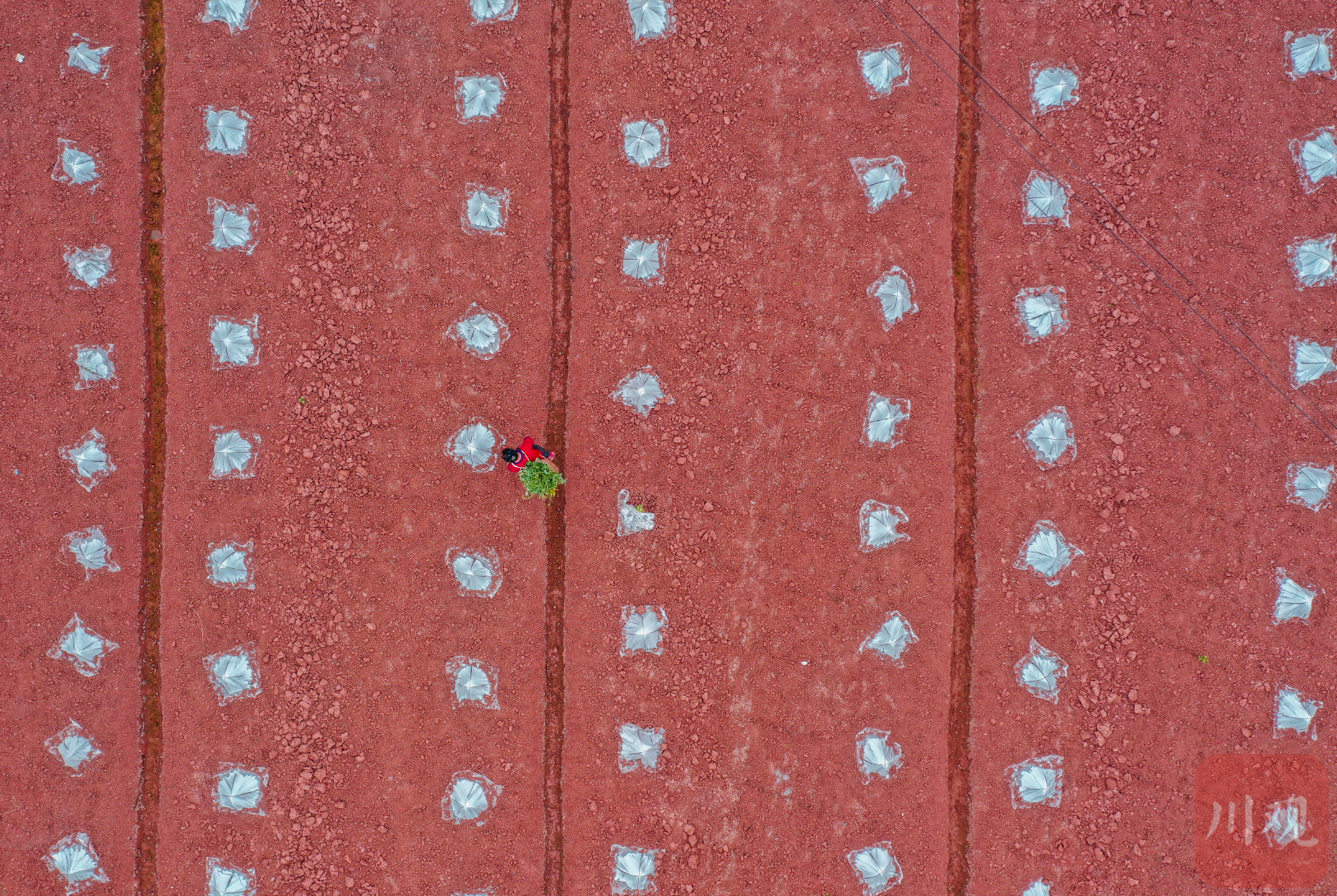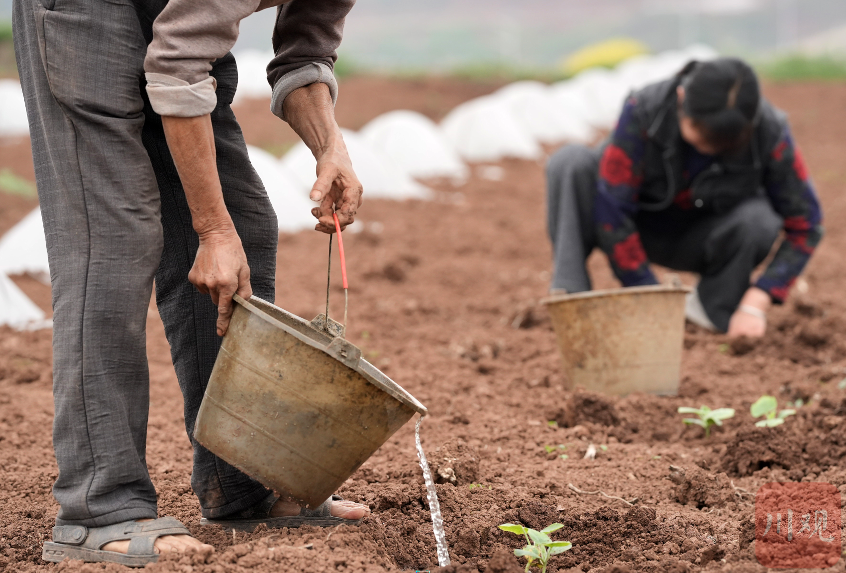 3月13日,宜宾市江安县迎安镇凤鸣村,南瓜种植户在田间移栽南瓜苗,大家种苗、浇水、盖膜等,覆膜后的南瓜苗整齐排列在土地中,犹如闪跃跳动的音符。