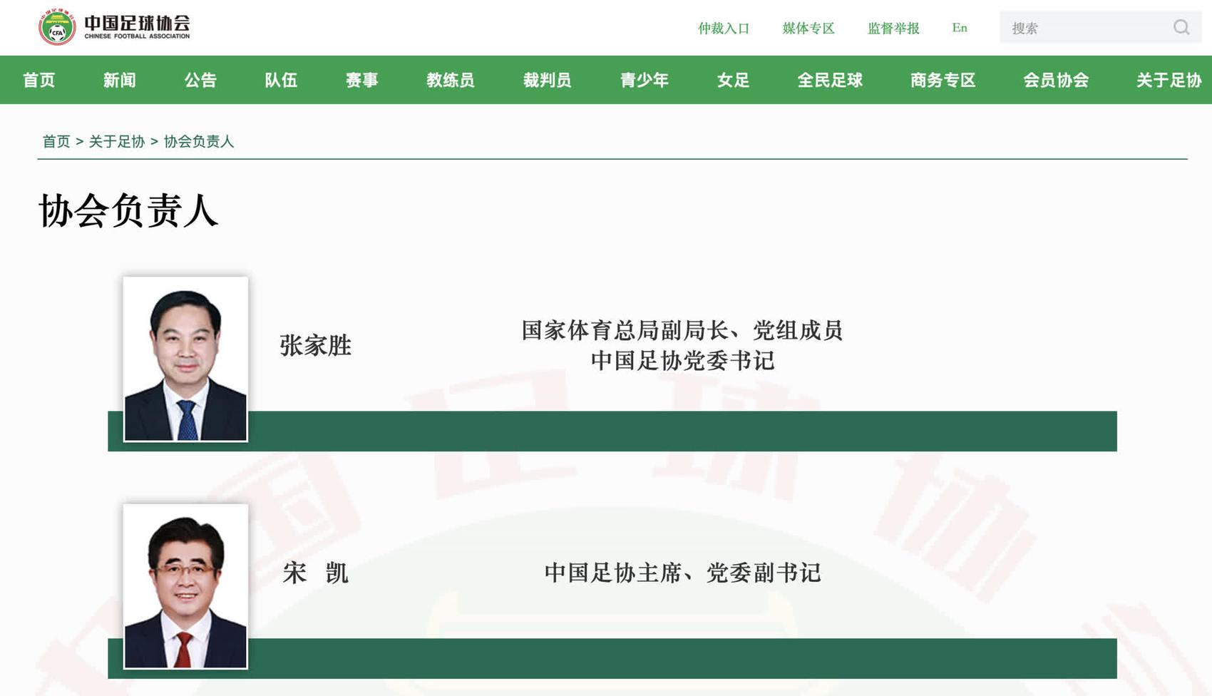 中国足协现任主席、党委副书记为宋凯。此前,另一位国家体育总局副局长李颖川兼任中国足协党委书记,他已于2月不再担任国家体育总局副局长职务。