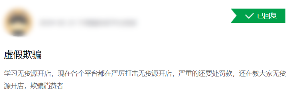网络投诉平台显示,今年2月18日,有创业者投诉称,“以无货源模式作为商业噱头,对众多学员进行洗脑。由于学员们都是‘小白’,因此对所谓的无货源模式并不了解。目前各大电商网络平台正在严厉打击无货源店铺,例如无法上品、链接失效,甚至存在非法行为等情况。这与当初培训时所提及无脑赚钱的说法根本不同。”