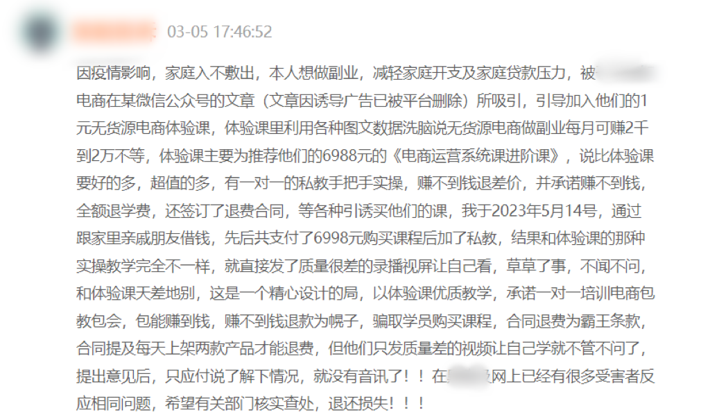 从投诉量较大的案例来看,多个创业小白称,某电商平台主播宣传自己做无货源电商6年开了19家店并示意大家购买课程一起创业。但在消费者购买后发现课程内容与宣传不符,按照订单界面显示7天内观看时长小于30分钟可退款,但客户申请退款时被拒。