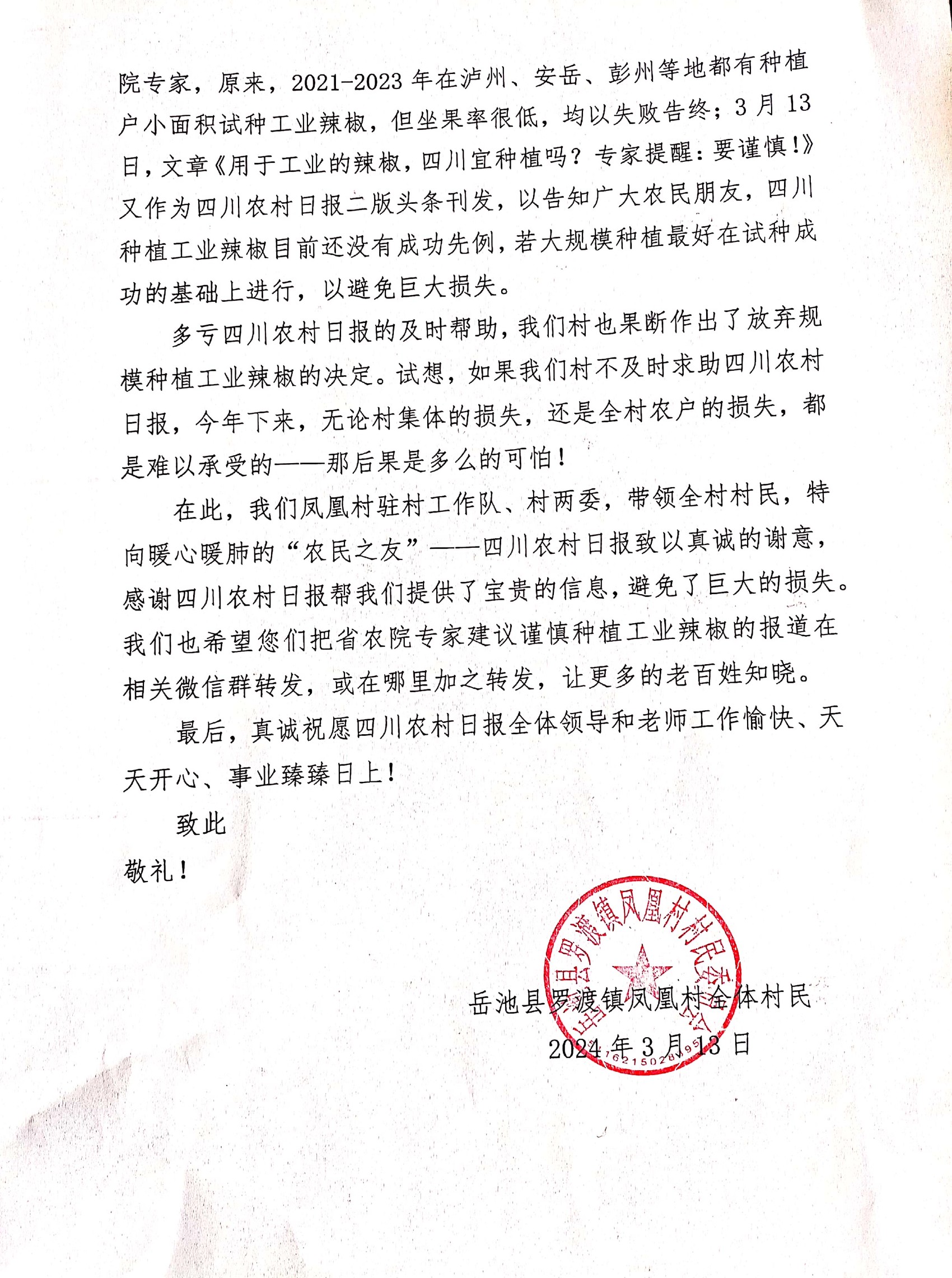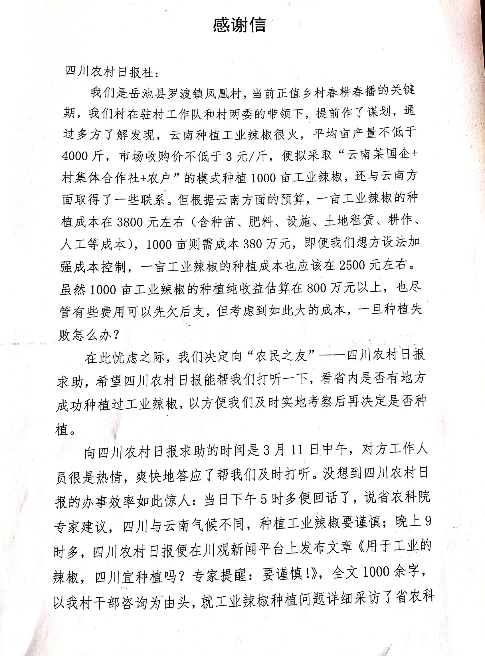 当前,正值春耕春播关键时节,同时也是辣椒播种、育苗、移栽期。3月11日、3月13日,四川农村日报相继在川观新闻川农报频道、四川农网、报纸等全媒体平台上,对四川地区种植工业用辣椒进行了及时的科普与提醒。很快,四川农村日报编辑部就收到了岳池县罗渡镇凤凰村全体村民的感谢信,衷心感谢本报的及时报道和提醒,为他们避免了有可能产生的经济损失。