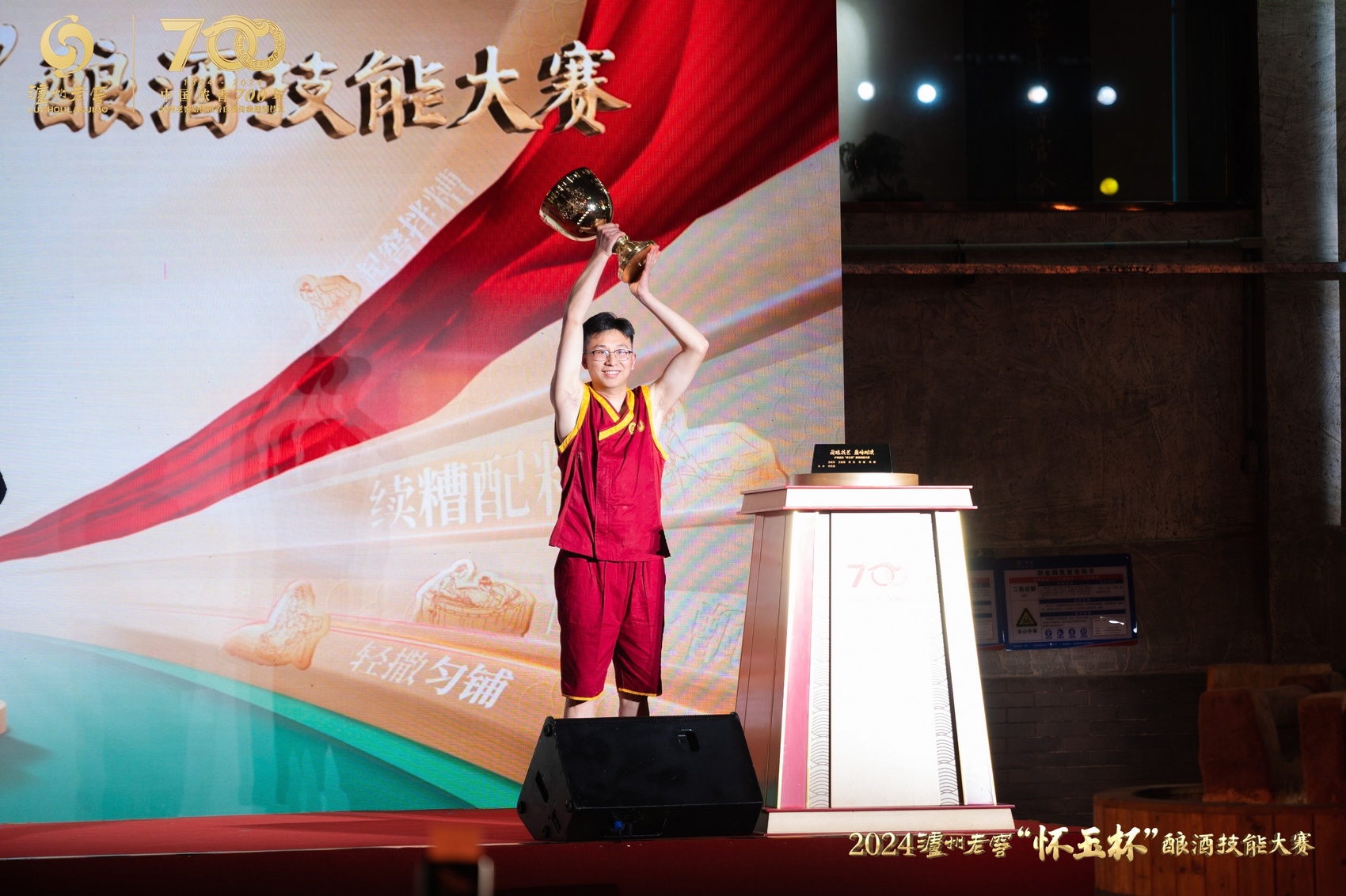 2023泸州老窖“怀玉杯”酿酒技能大赛总冠军何先强再度登顶,高举2024冠军奖杯庆祝守擂成功。
