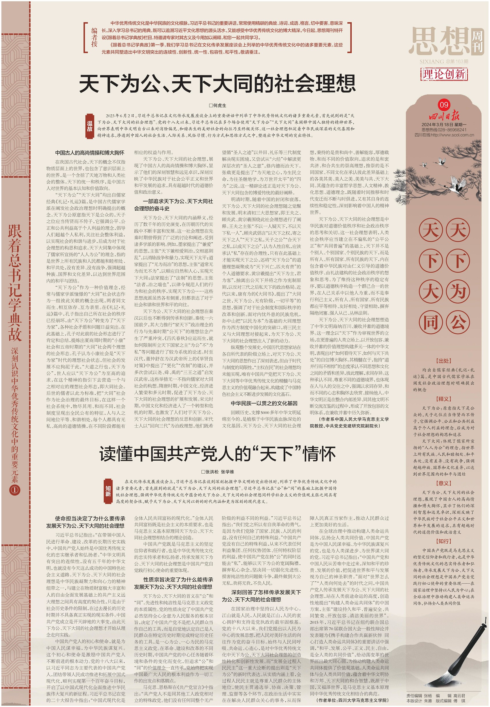 2023年6月2日,习近平总书记在文化传承发展座谈会上的重要讲话中列举了中华优秀传统文化的诸多重要元素,首先说到的是“天下为公、天下大同的社会理想”。党的十八大以来,习近平总书记在多个场合使用“天下为公”“天下大同”来阐释中国人独特的精神世界,向世界表明中华文明自古以来对消除偏见、和谐共生的美好社会的向往乃至终极关怀。这一社会理想积淀着中华民族深层的文化基因和精神追求,渗透到中国人的社会生活、人际关系、风俗习惯、行为方式和思维方式之中,塑造出中华文明的突出特性。