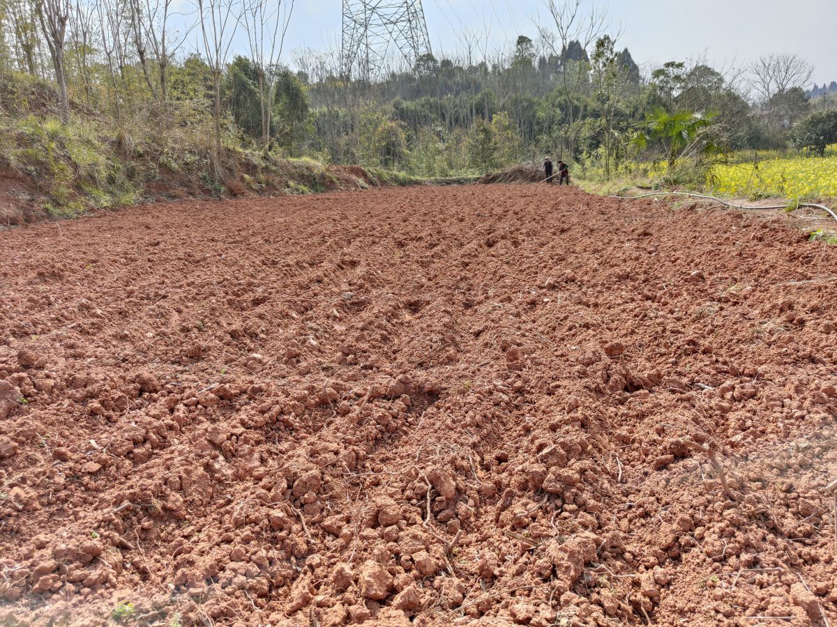 磨池河村刚完成开沟挖穴的坡地等待稻种下地。