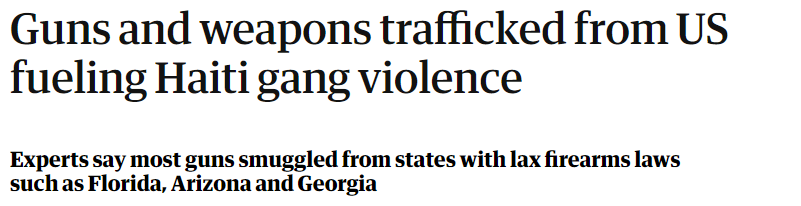 伊加拉佩研究所安全智库创始人、安全专家罗伯特·穆加(Robert Muggah)表示,其中大部分武器是从美国走私来的,美国枪支轻易外流是加剧海地社会治安恶化的因素之一,大量的非法武器极大程度地增强了犯罪团伙的武力,导致性侵、暴力袭击、绑架等暴力犯罪频发。