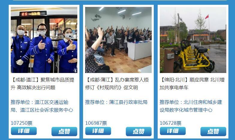 温江区交通运输局、温江区社会诉求服务中心推荐的案例《聚焦城市品质提升 高效解决出行问题》获得的点赞数最高,达107250次;蒲江县行政审批局推荐的案例《乱办宴席惹人烦 修订<村规民约>促文明》获得106987次点赞,排名第二;北川住房和城乡建设局数字化城市管理中心推荐的案例《顺应民意 北川增加共享电单车》获得106728次点赞,排名第三。