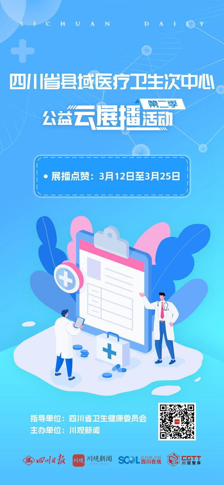 由省卫生健康委、川观新闻联合开展的“四川省县域医疗卫生次中心公益云展播活动”(第二季),即日起正式开启线上展播,快来为你认可的县域医疗卫生次中心点赞吧!