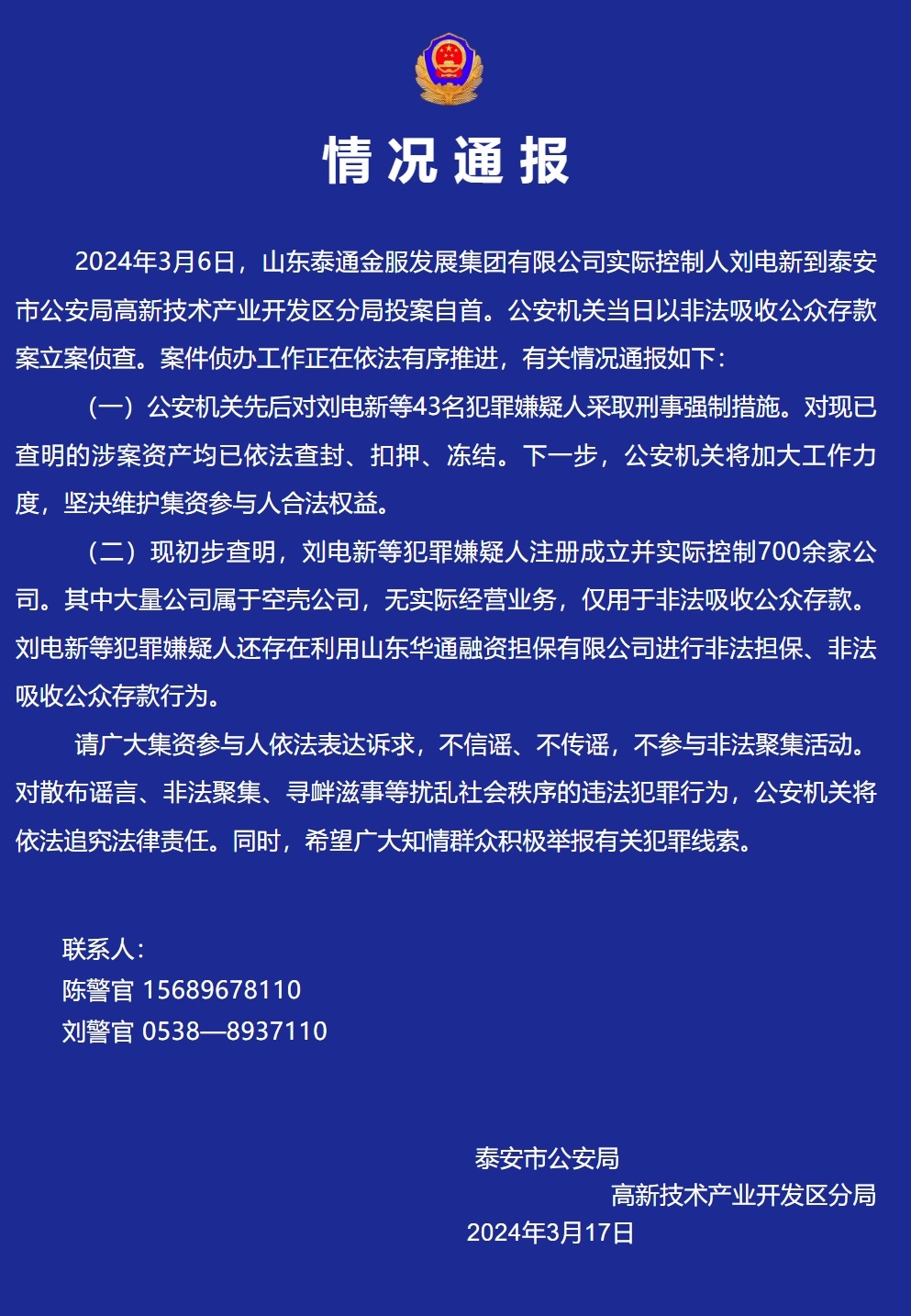 据泰安高新警方微信公众号消息,2024年3月6日,山东泰通金服发展集团有限公司实际控制人刘电新到泰安市公安局高新技术产业开发区分局投案自首。公安机关当日以非法吸收公众存款案立案侦查。案件侦办工作正在依法有序推进,有关情况通报如下: