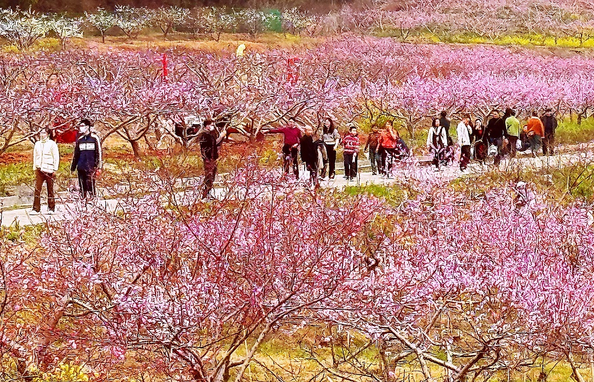 3月16日,涪城区“五朵金花”——丰谷镇桃花旅游节开幕式在“蔬香绿野”农业主题公园举行。沿千亩桃园一路前行,随处可见的粉嫩桃花或含苞待放或向阳盛开,一棵棵披着“盛妆”的桃树将青山妆点成粉色的海洋,让无数游客“桃醉”在这最美的春天里。