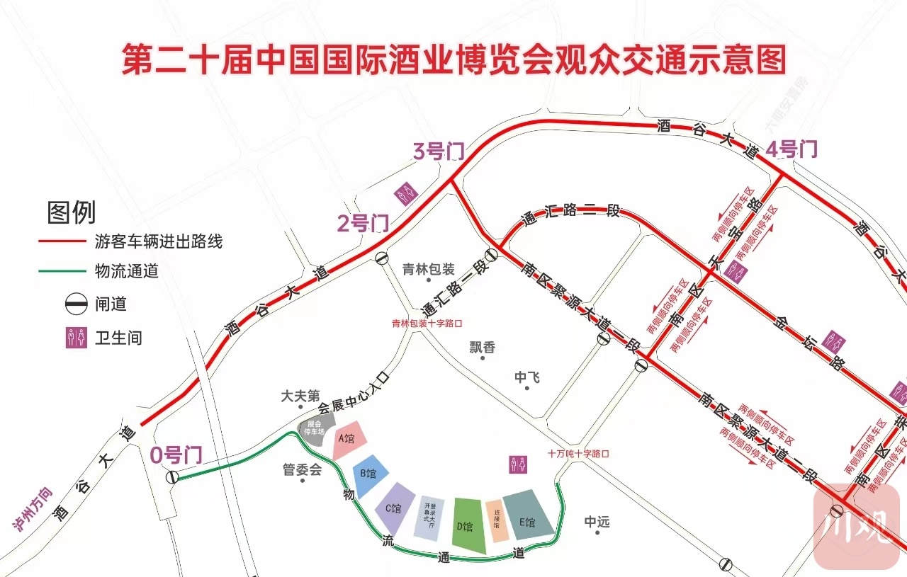 展会期间,会展中心实行车辆通行管理:0号门为持证车辆、物流车辆和展商接送车辆通行;2号门为观展群众步行通道,车辆禁止通行;3号门为社会车辆通行,直行至4号门方向南区聚源大道路段靠边停车并从4号门出;4号门为社会车辆通行,至金坛路路段靠边停放并从4号门出。
