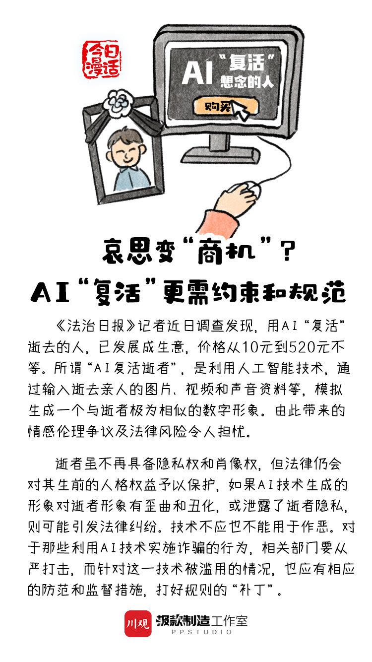 人工智能技术日新月异,一个显见的与AI共生、彼此融入的时代扑面而来,但这并不意味着,一些人就可以肆无忌惮地“抢跑”。它不是一场游戏,而是一件关乎法律、伦理、人文等要素的严肃事件。保持敬畏,守住边界,为了逝者,也为了活着的人。