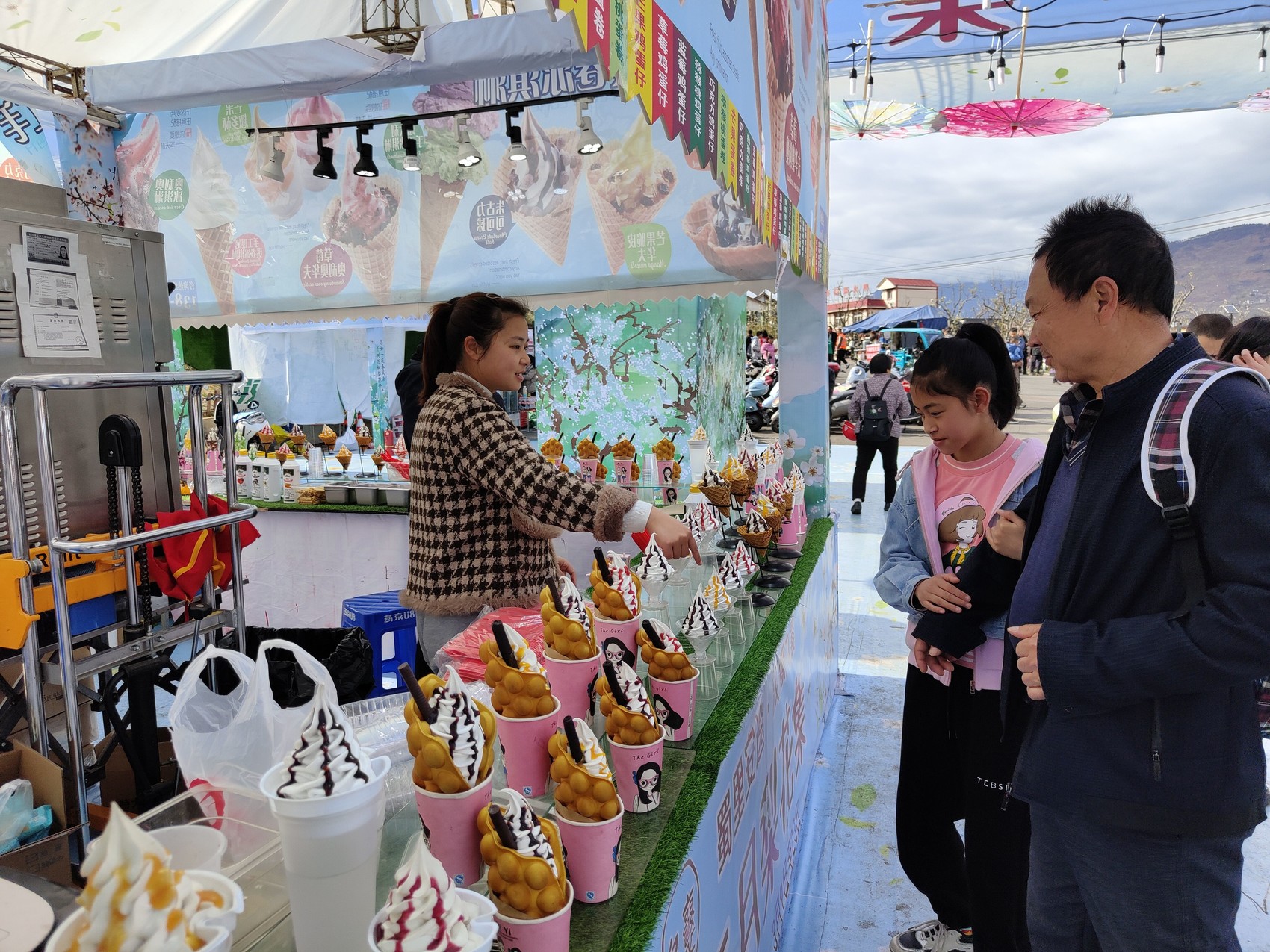 临时市集上,游客正在选购手工烤蛋卷冰淇淋。