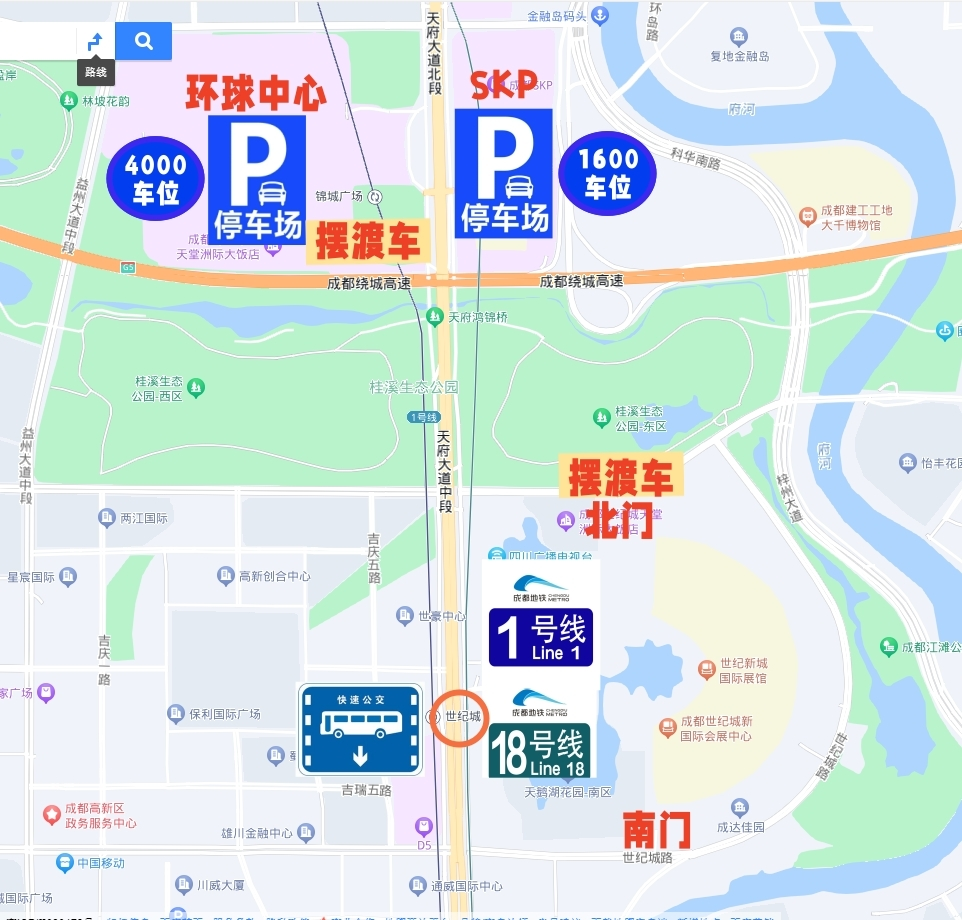 临时接驳车运行线路:世纪城北门(设置临时上下客点)→沿世纪城路和环馆路路口左转进入环馆路→环馆路与天府大道路口右转进入主道→锦悦东路和天府大道路口调头→进入环球中心停车区(设置临临时上下客点) →沿天府大道直行→天府大道与世纪城路路口左转进入世纪城路→世纪城北门(设置临时上下客点)。