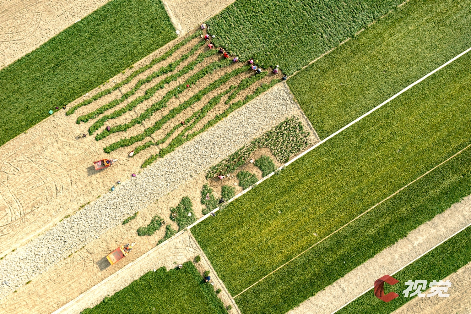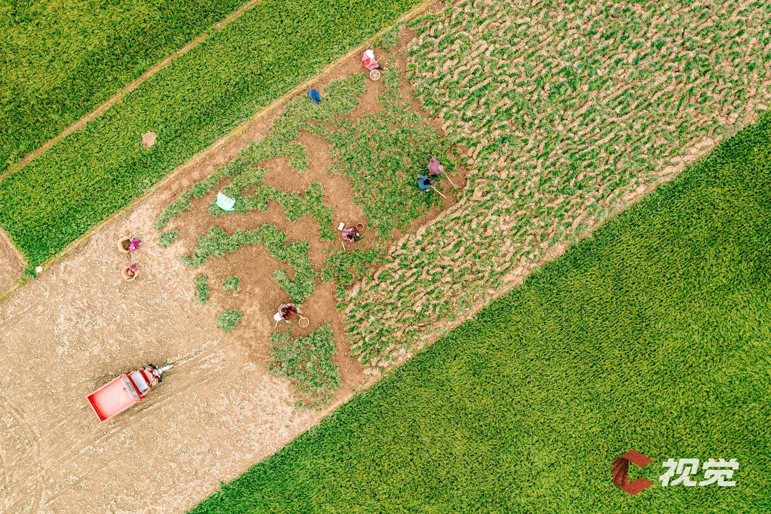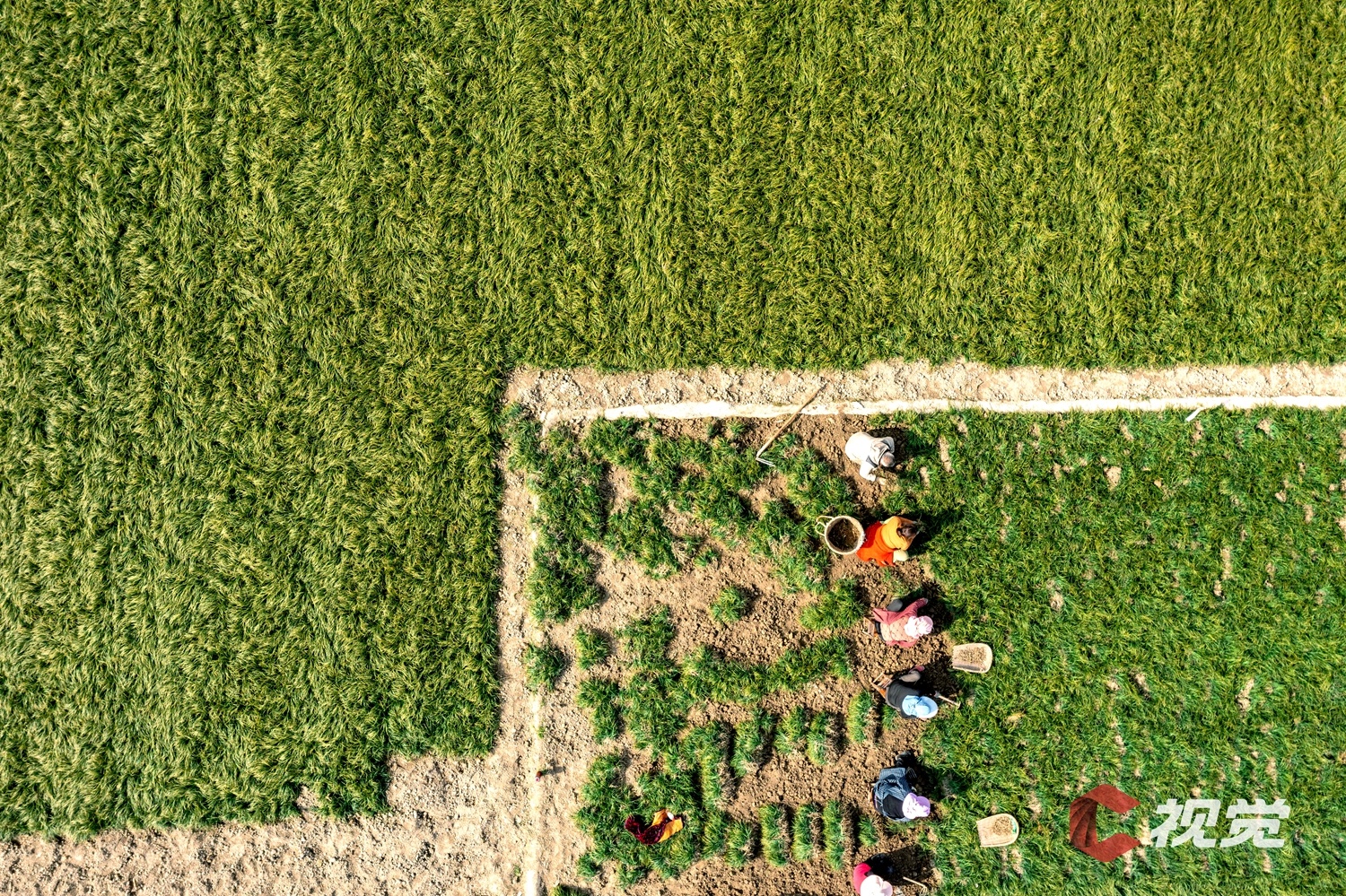 沃野千里地藏宝,绿意葱茏麦冬翠。采挖果实一串串,捡拾丰收笑盈盈。