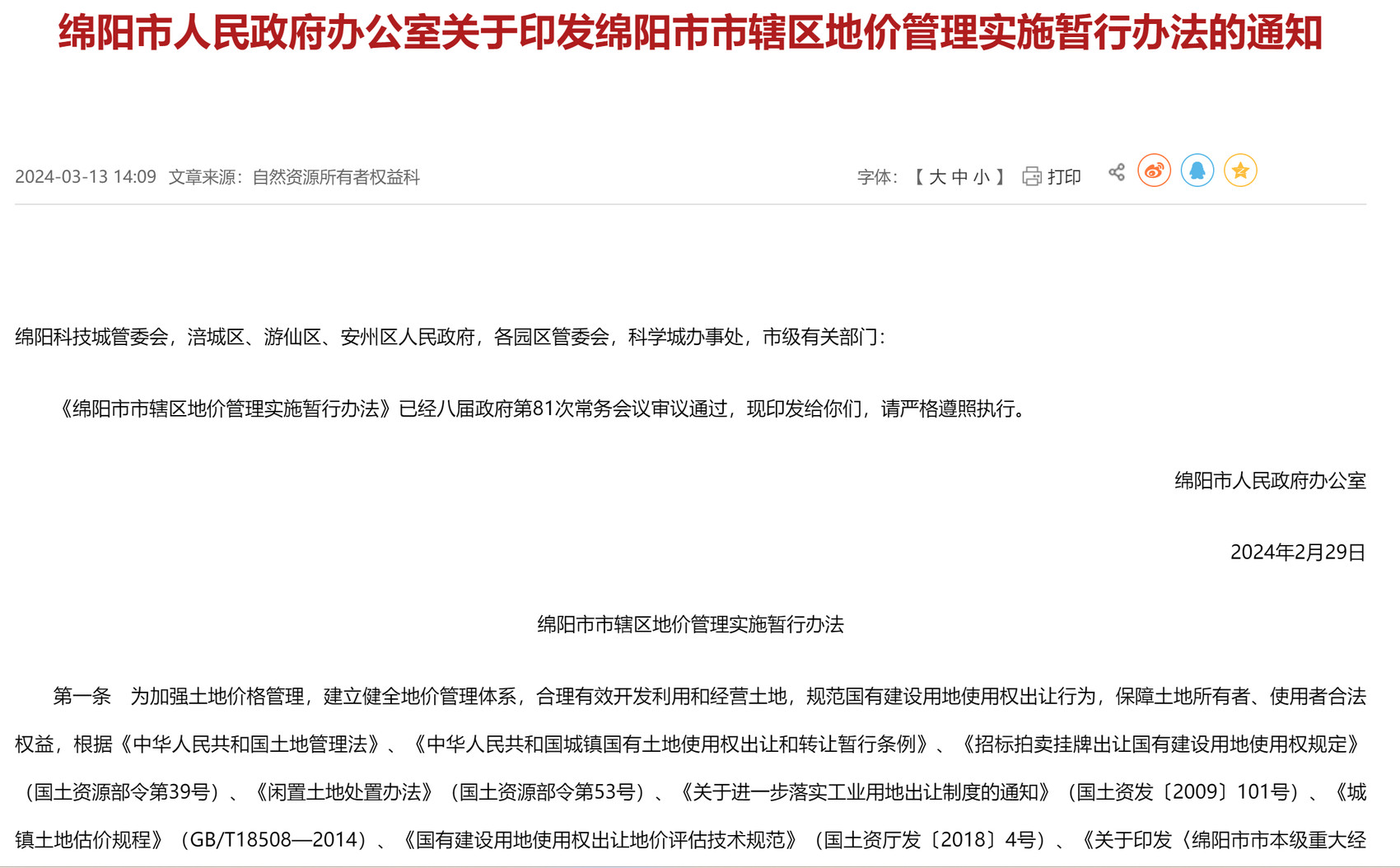 3月19日,记者从绵阳市自然资源和规划局获悉,《绵阳市市辖区地价管理实施暂行办法》(以下简称《办法》)已于近日正式印发。据悉,绵阳是全省最早针对地价管理出台规范性文件的地级市,2011年出台第一稿,本次出台的《办法》已是修订的第四稿。 一起来看《办法》有哪些新变化?