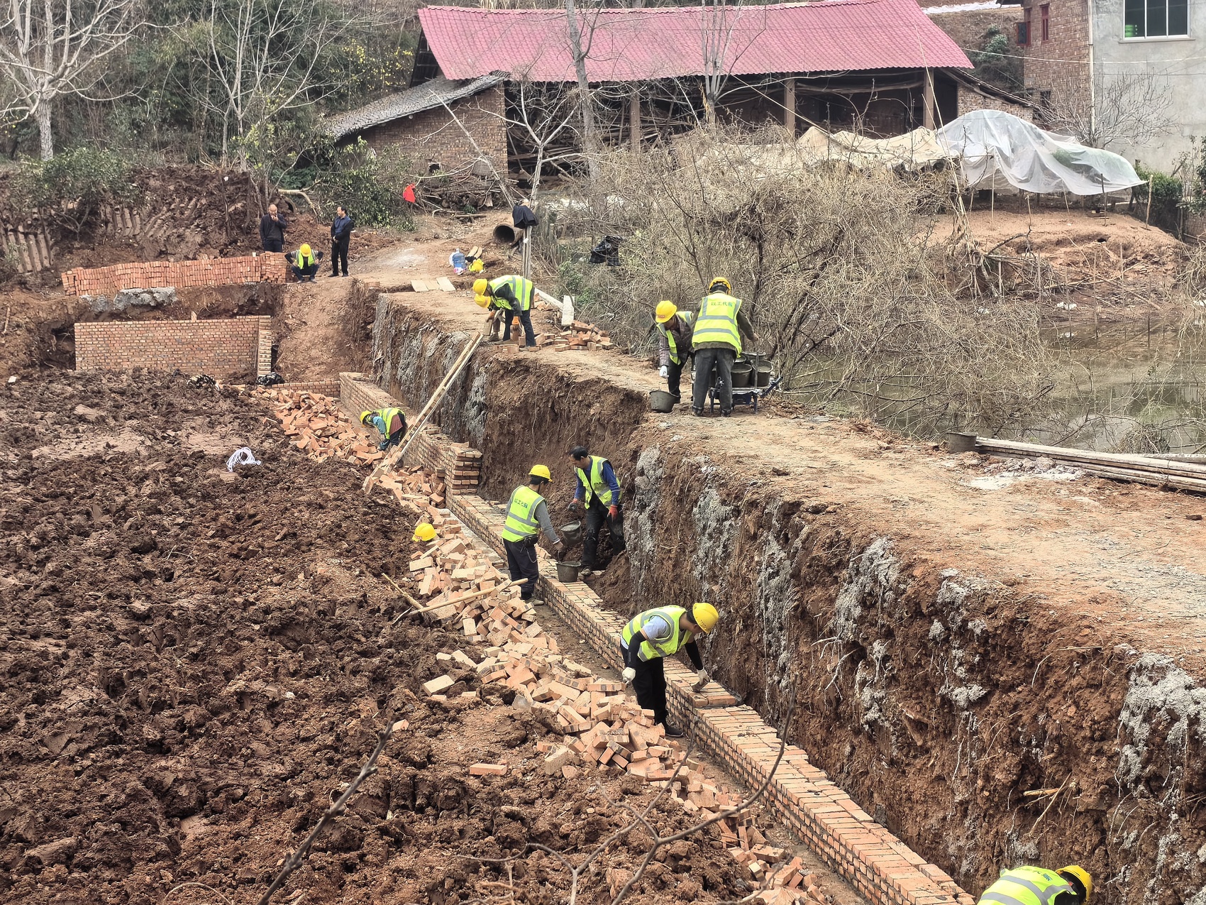 3月18日,内江市资中县孟塘镇白莲村6组的以工代赈项目建设现场,人们各司其职,搬运红砖、搅拌砂浆、砌砖,在大家熟练地配合下,项目建设的山坪塘迎水面已初露雏形。
