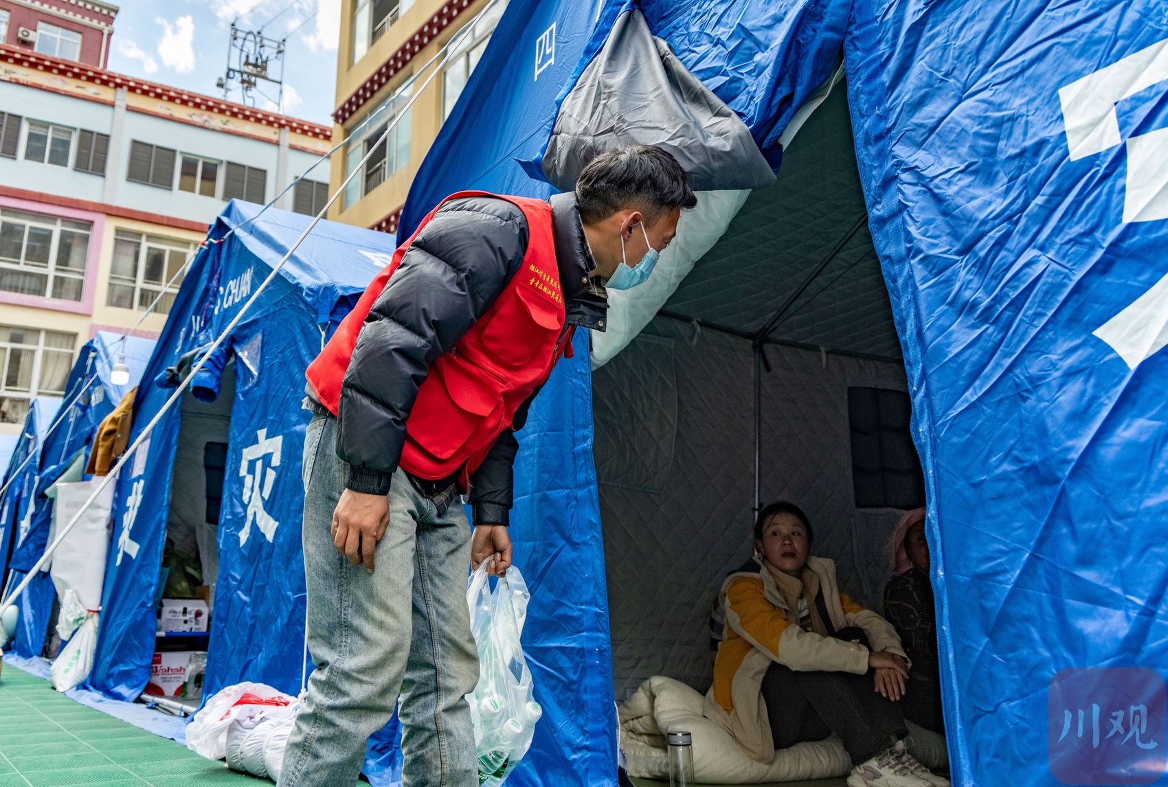 刘凯强在安置点发放矿泉水。洛绒尼玛 摄