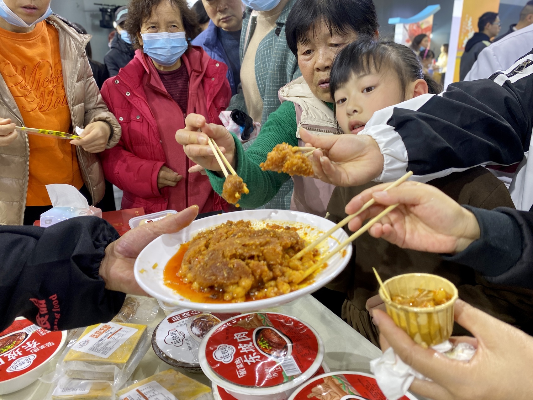 参观者正在试吃具有眉山本地特色的粉蒸肉预制菜。