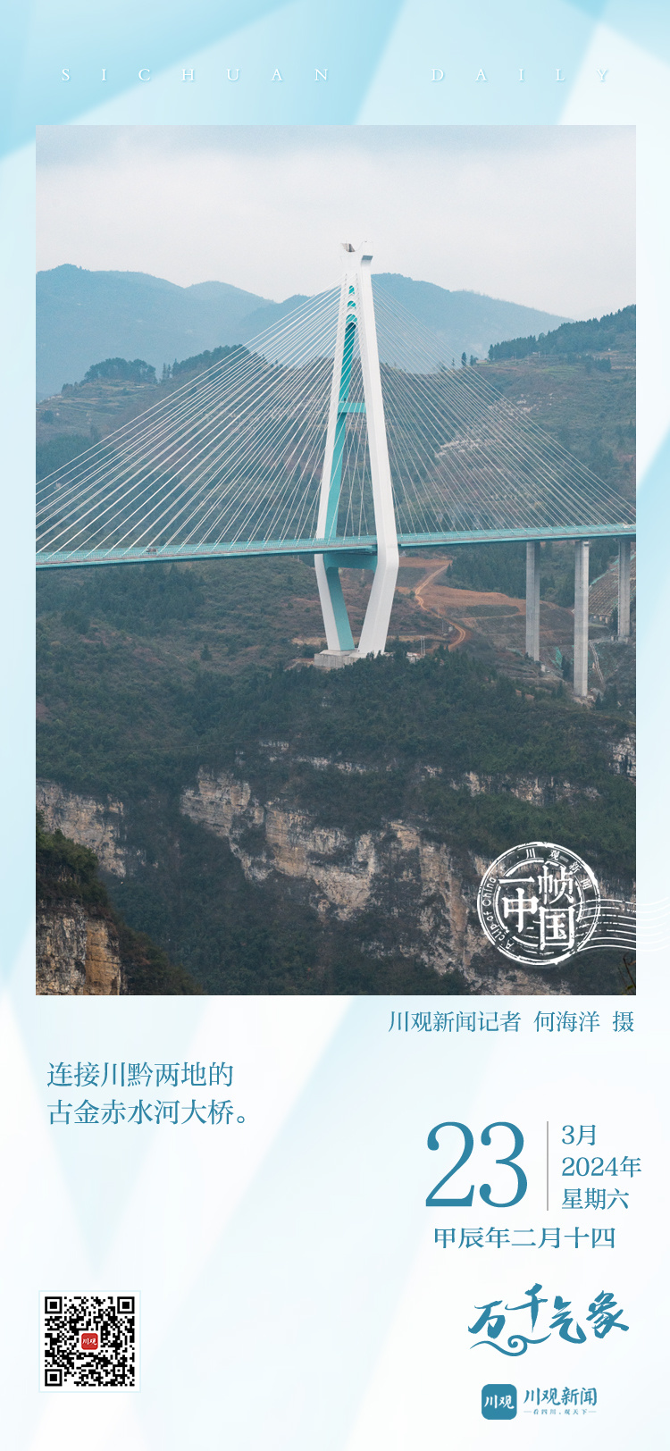 今天的《一帧中国》,川观新闻带您来到川黔交界“上春山”,图览古金高速壮观的古金赤水河大桥。这座大桥全长1087米,其中主跨为575米,横跨赤水河,两岸山清水秀春景秀美。