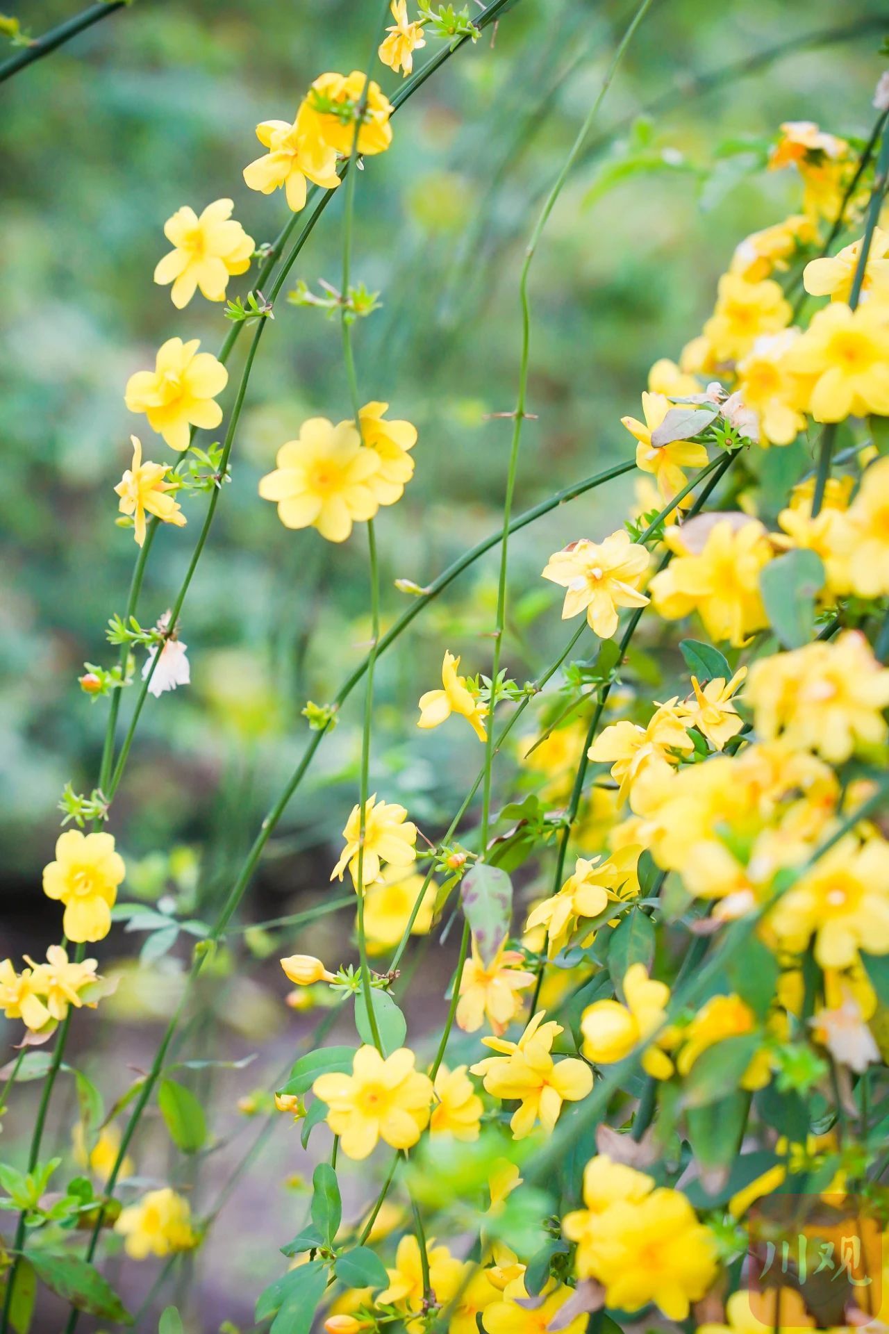 作为春天的使者,春风一吹,守时的迎春花便密密匝匝地绽放在枝蔓上,天池公园的迎春花躲开闹市的喧嚣,伸展一冬的束缚向世人昭示着春之来临。