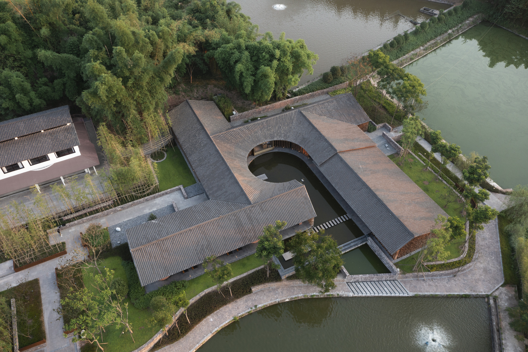 整个建筑采取十字风车型布局,大屋檐沿周边水塘铺开,引入最大观景面。错落的墙体将空间切分,内设茶室、书吧等功能,每个分支对应不同方向的自然景观,让建筑和环境相融。