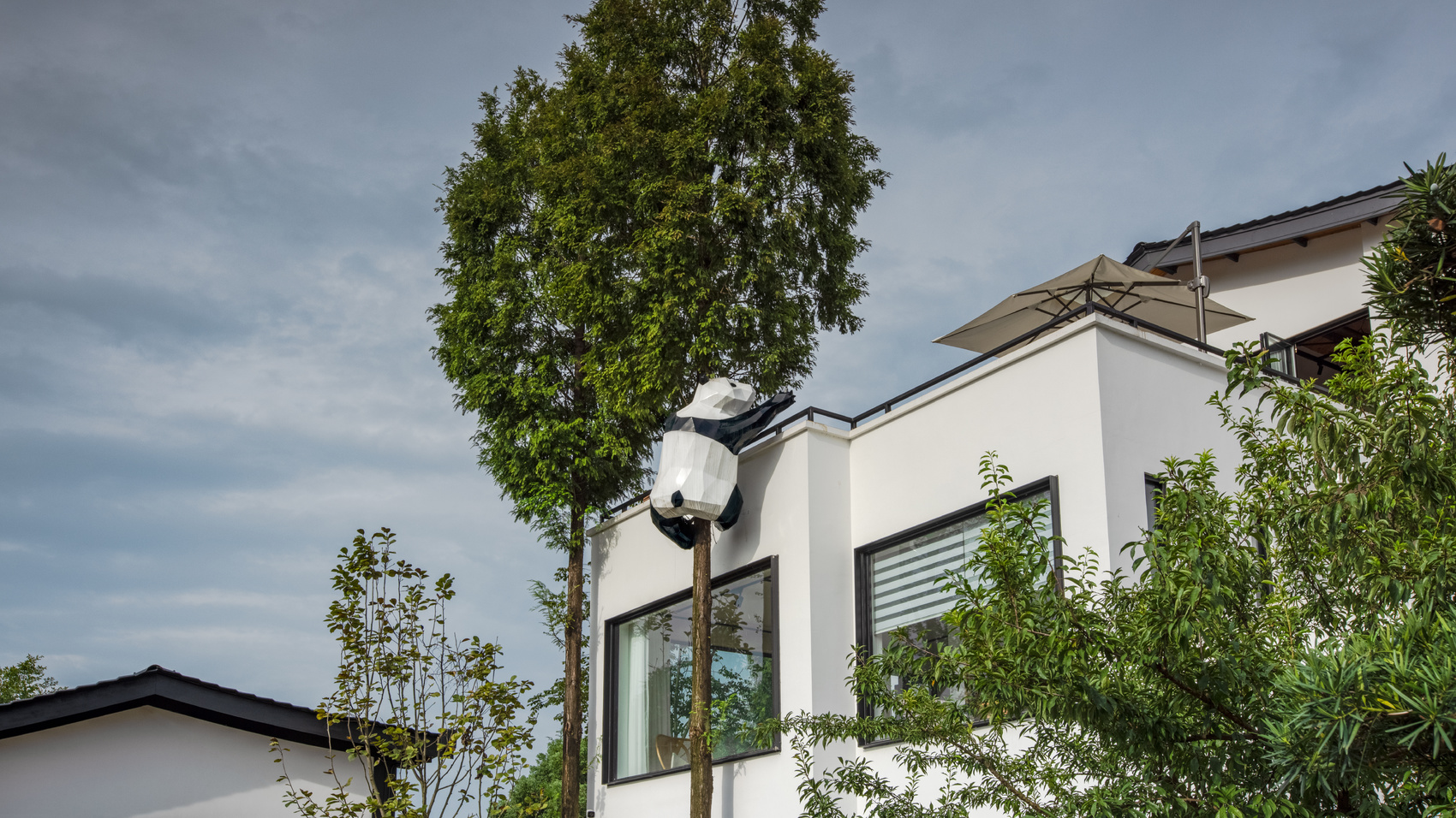 川音艺谷一角,憨态可爱的大熊猫爬上阳台