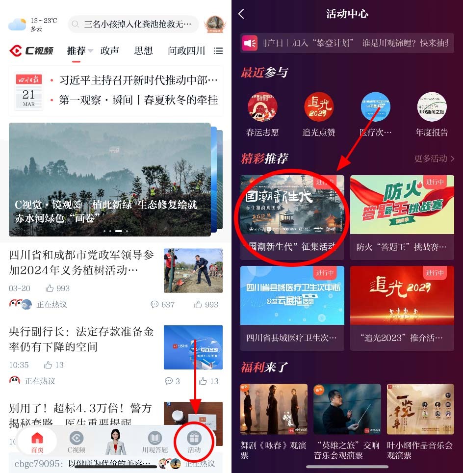 2.在川观新闻首页,点击“我的”—“活动中心”,找到活动图片,点击即可参与。