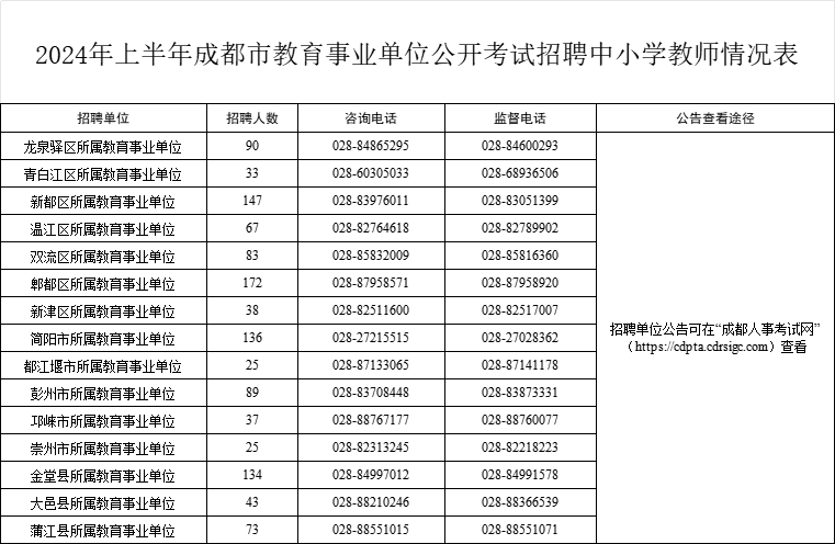 《2024年上半年成都市教育事业单位公开考试招聘中小学教师情况表》