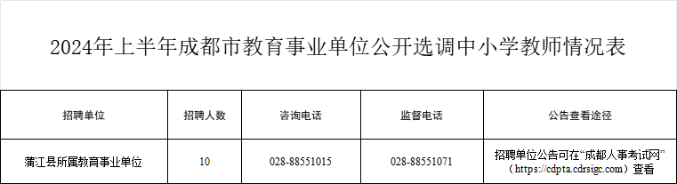 龙泉驿区、青白江区、新都区、温江区、双流区、郫都区、新津区、简阳市、都江堰市、彭州市、邛崃市、崇州市、金堂县、大邑县、蒲江县15个区(市)县所属教育事业单位公开考试招聘中小学教师1192名,蒲江县公开选调中小学教师10名,详见《2024年上半年成都市教育事业单位公开考试招聘中小学教师情况表》《2024年上半年成都市教育事业单位公开选调中小学教师情况表》。
