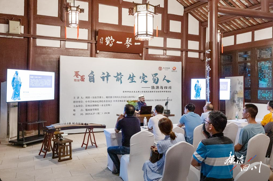 新打造的罨画池廉洁文化基地内,四川大学历史文化学院周鼎博士正在讲解陆游与四川的故事。