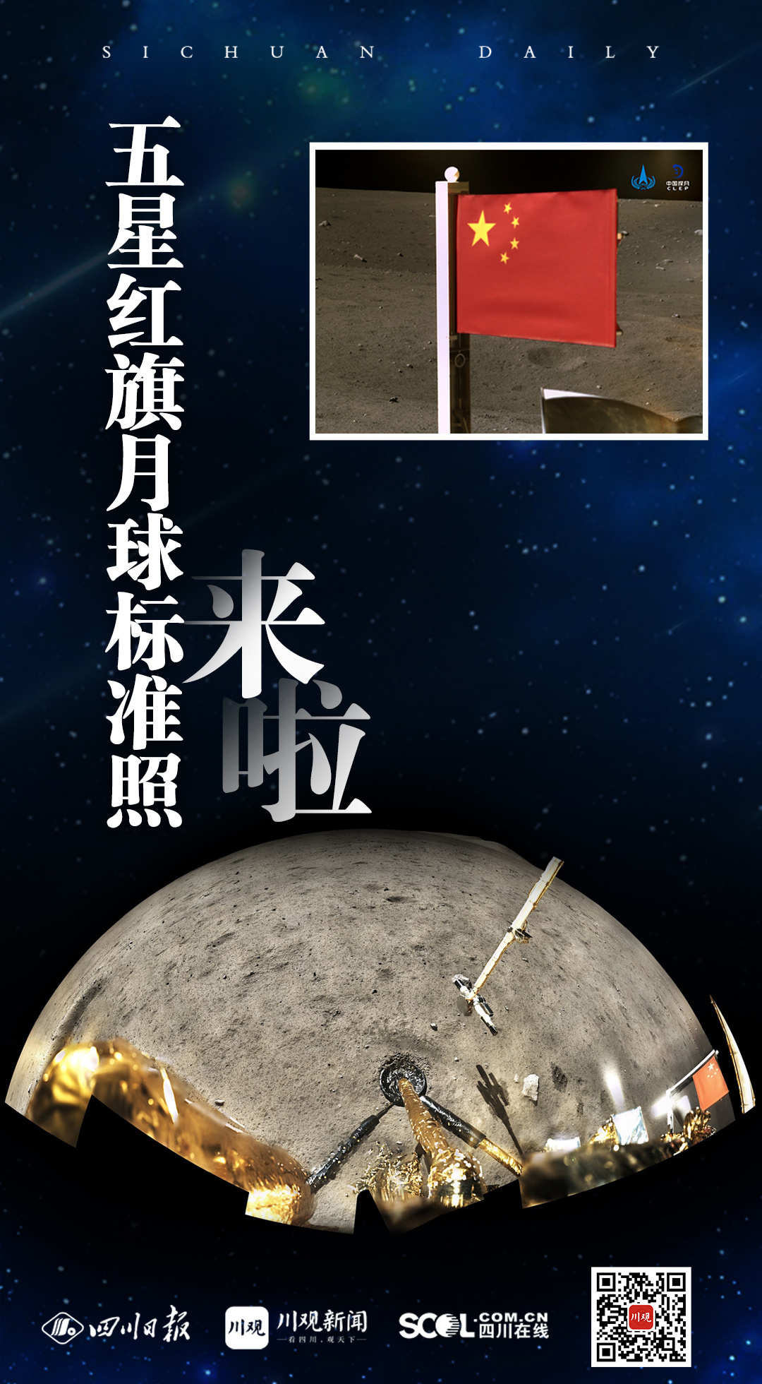 今天,国家航天局公布了探月工程嫦娥五号探测器在月球表面国旗展示的照片。这是继嫦娥三号、四号任务后,五星红旗又一次展现在月球表面,同时也是五星红旗第一次月表动态展示。