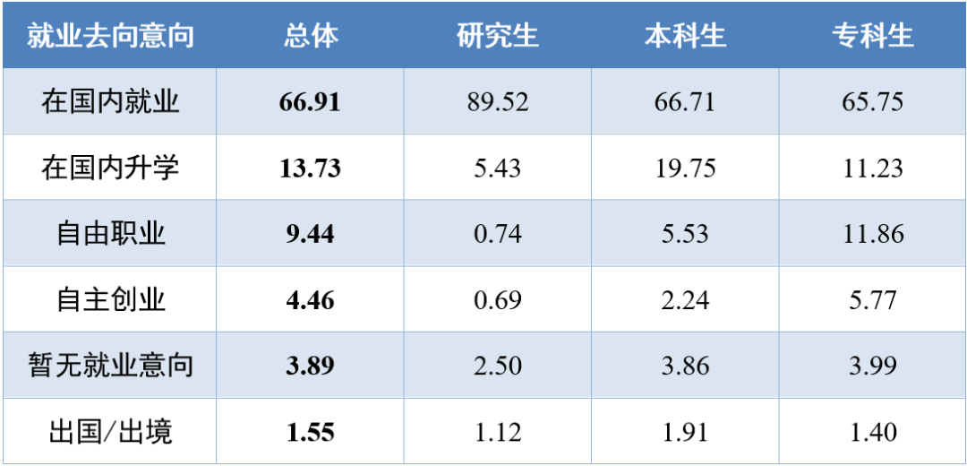 总体及不同学历毕业生毕业去向意向(单位:%)