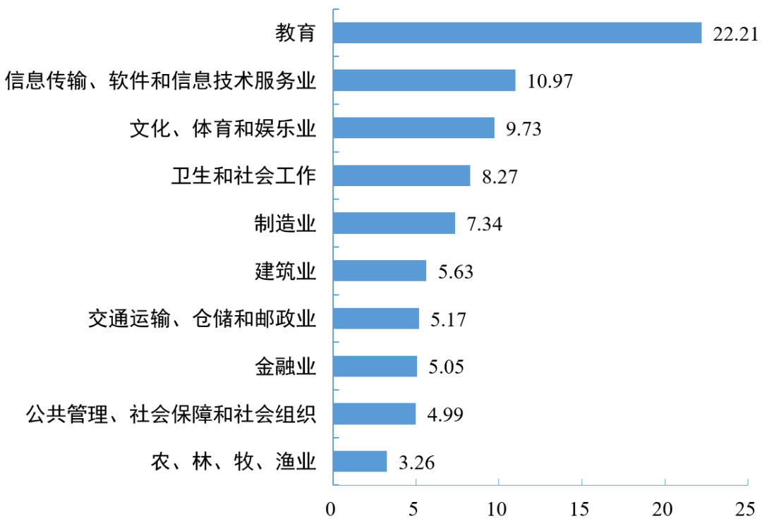 从就业行业意向来看,想在教育行业就业的比例(22.21%)最高,其次为信息传输、软件和信息技术服务业(10.97%),第三是文化、体育和娱乐业(9.73%)。从学历层次看,研究生、本科生和专科生首要意向就业行业均为教育行业。