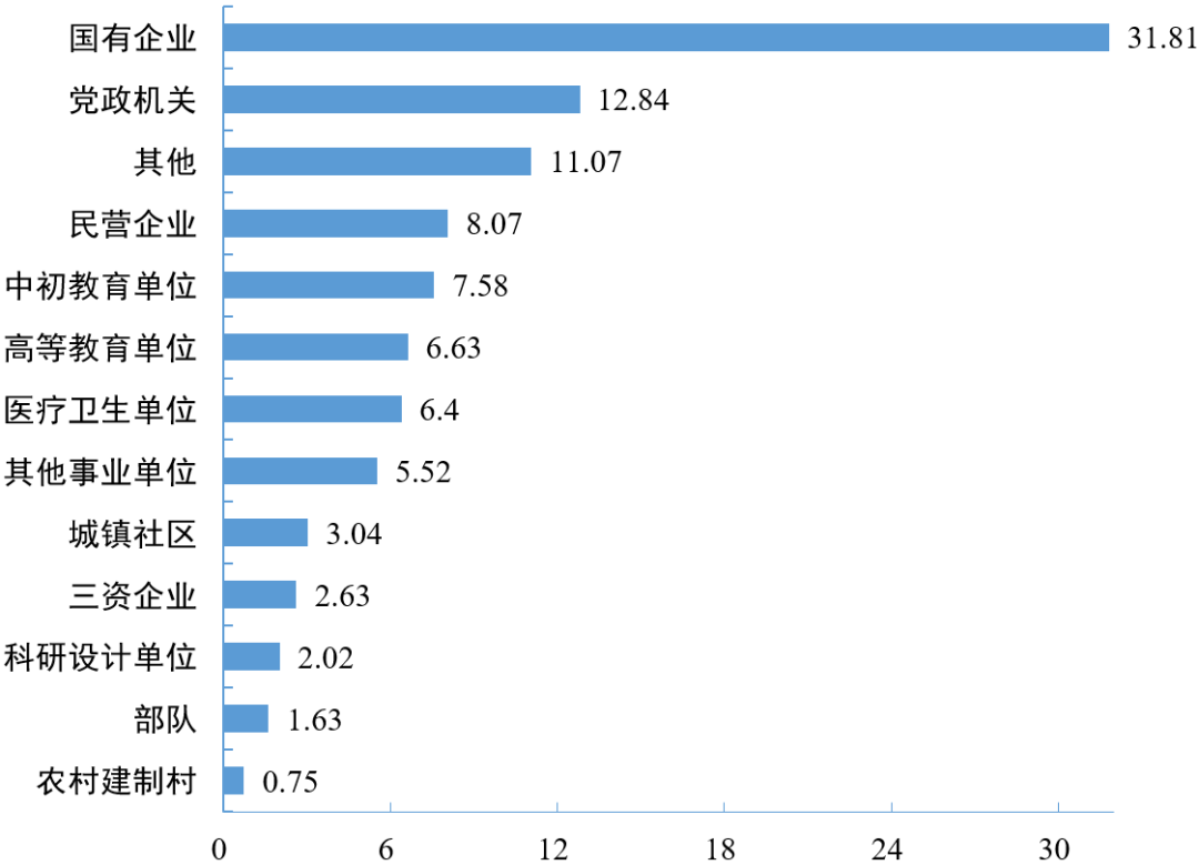 从就业单位性质意向来看,想在国有企业就业的比例(31.81%)最高,其次为党政机关(12.84%),第三是其他(11.07%)。从学历层次看,专科生意向在国有企业就业的比例(33.28%)高于本科生(29.48%)和研究生(25.30%)。