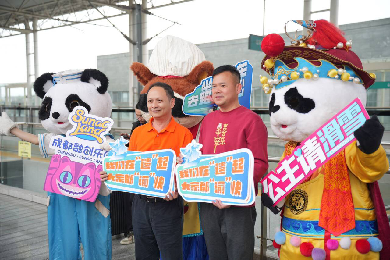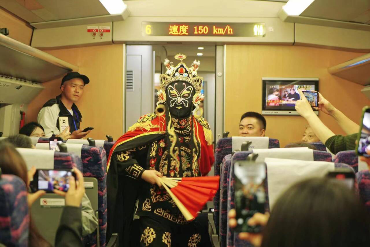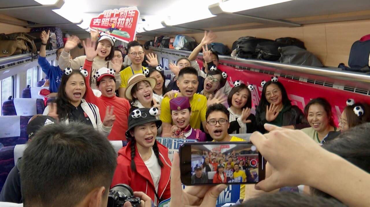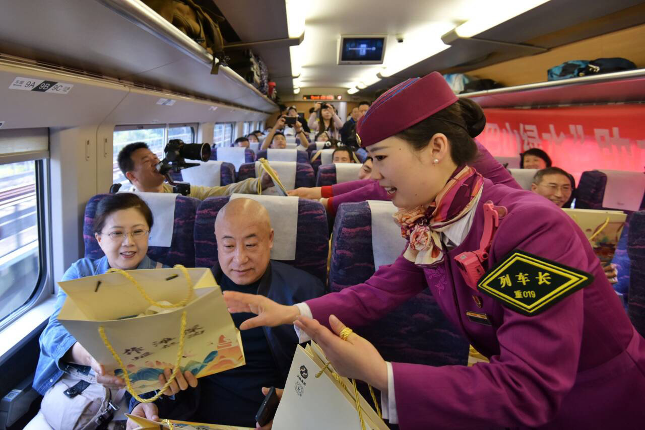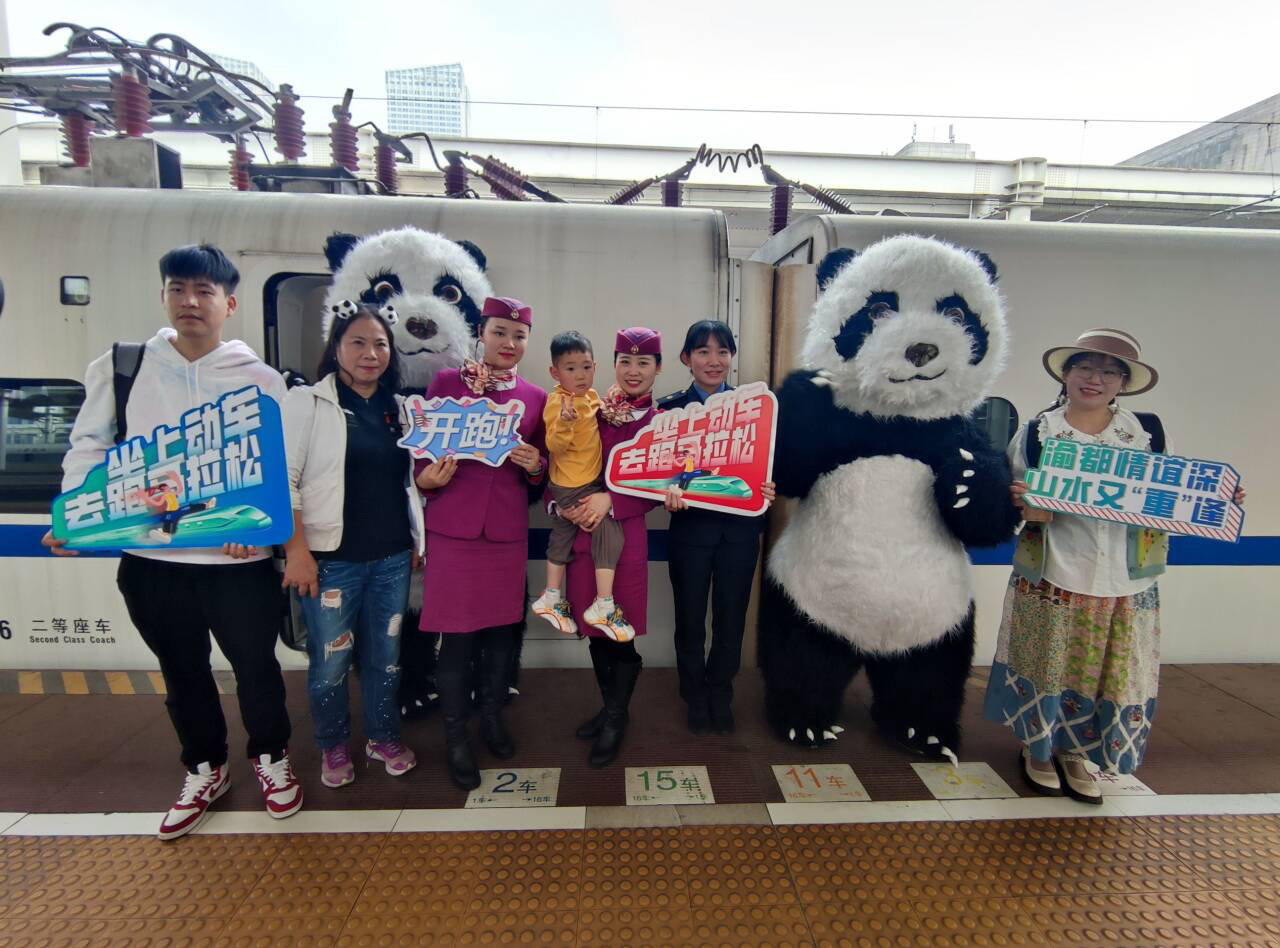 首列重庆北-青城山动车迎来了一群特殊的旅客,他们是将在3月24日参加2024成都双遗马拉松比赛的重庆跑友团,包括200多名重庆跑友携亲友乘坐该趟列车驶向都江堰。