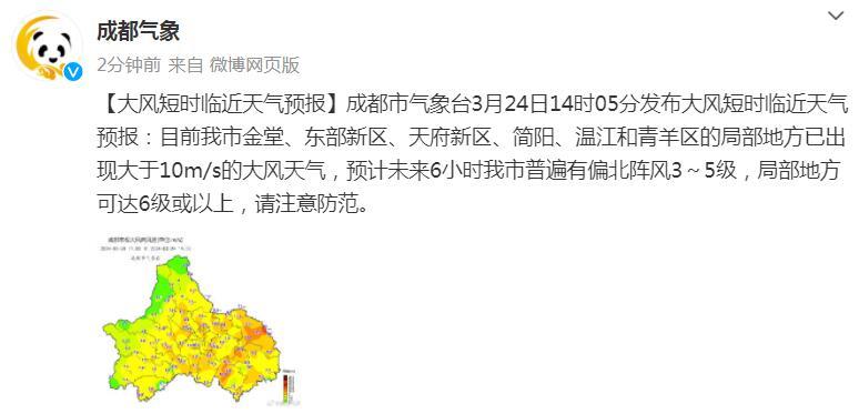 成都市气象台3月24日14时05分发布大风短时临近天气预报:目前成都市金堂、东部新区、天府新区、简阳、温江和青羊区的局部地方已出现大于10m/s的大风天气,预计未来6小时成都市普遍有偏北阵风3~5级,局部地方可达6级或以上,请注意防范。
