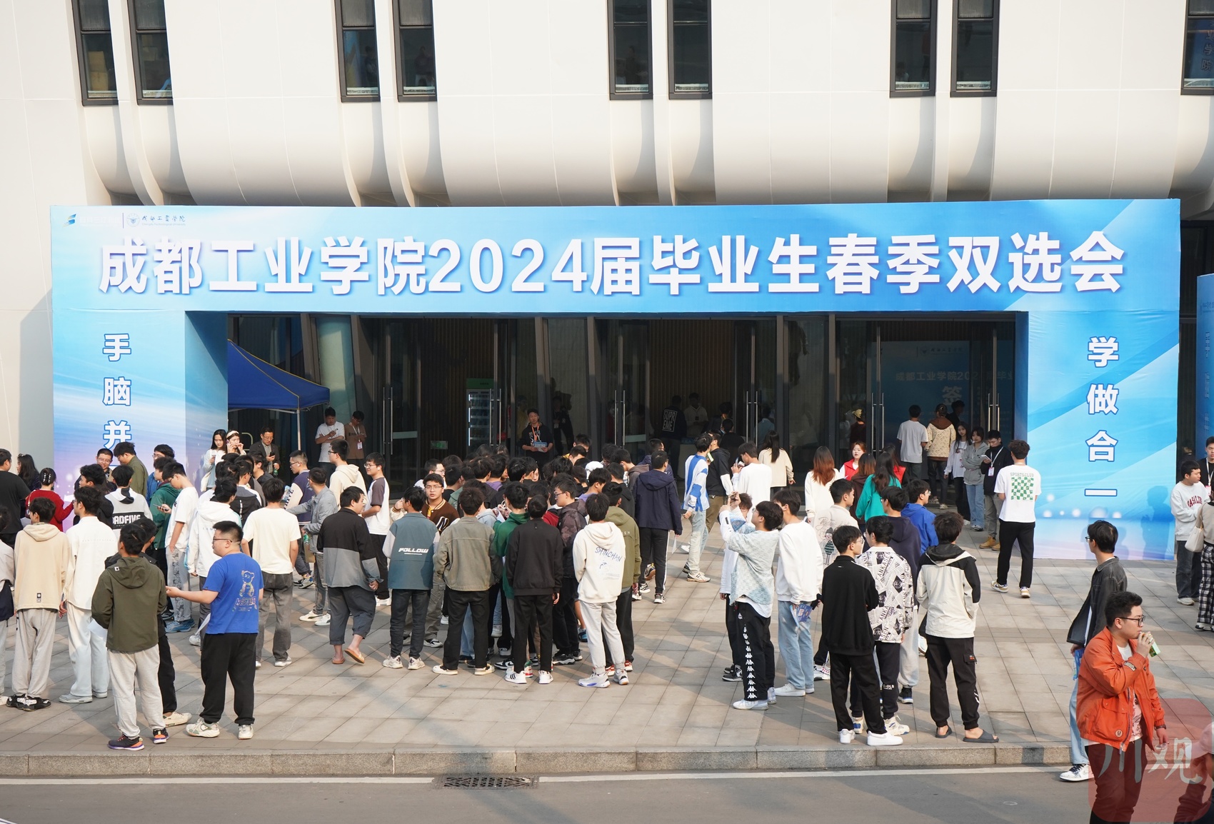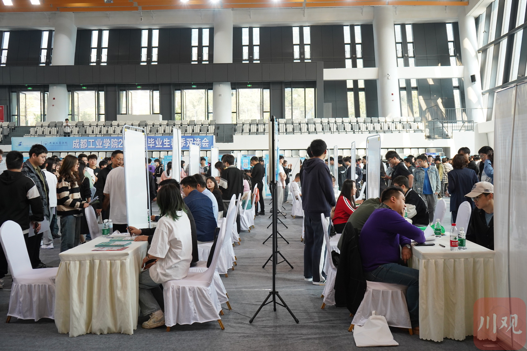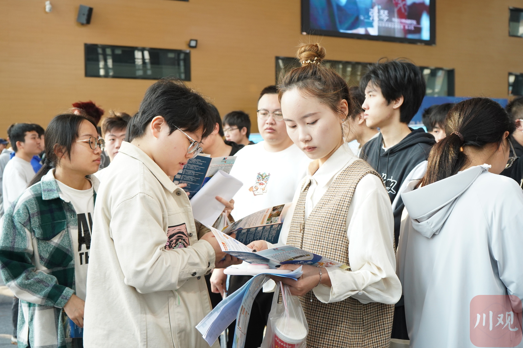 记者在成都工业学院宜宾校区看到,招聘会现场人头攒动,各参会企业通过设置招聘展板、发放宣传页以及面对面交流等方式,向毕业生详细解答他们关心的薪资、福利、职业发展等问题。