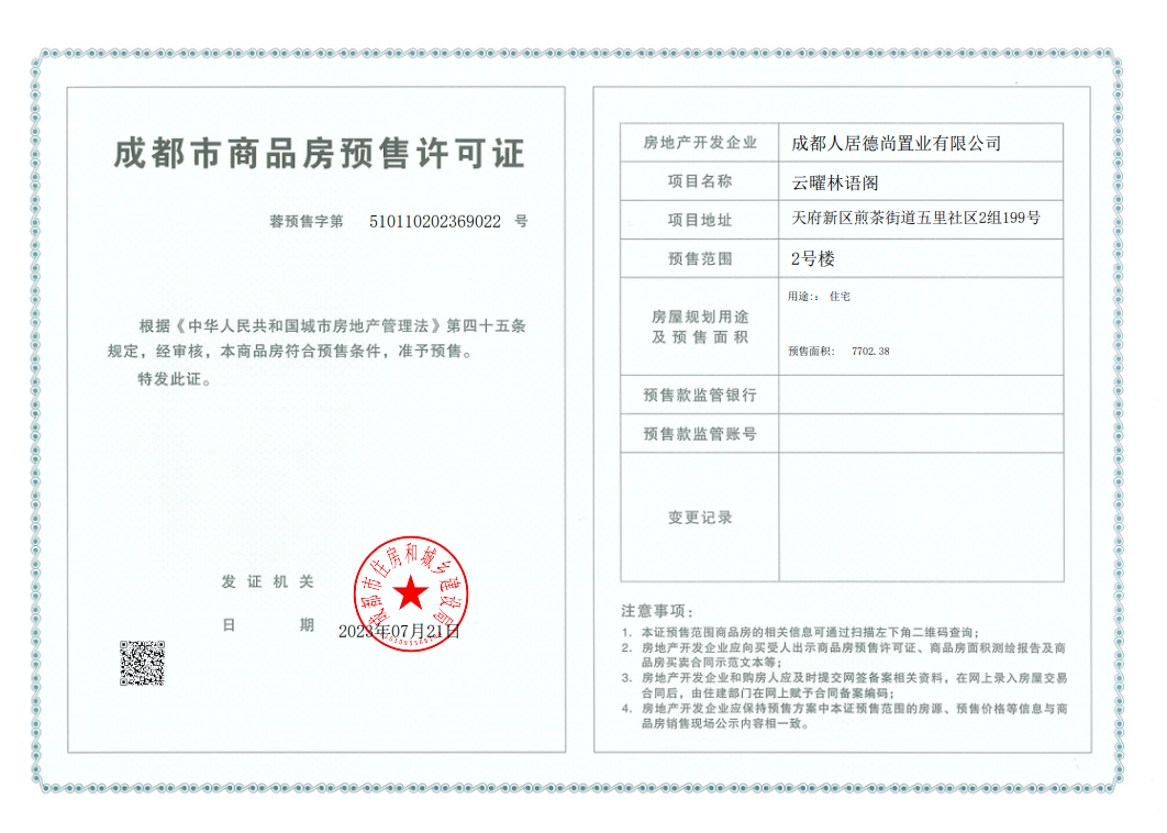 公开资料显示,人居云曜林语于2023年7月21日取得预售证,预售证号为510110202369022,预售楼栋为2号楼,共计64套房源,备案价为24732.55元/m2。